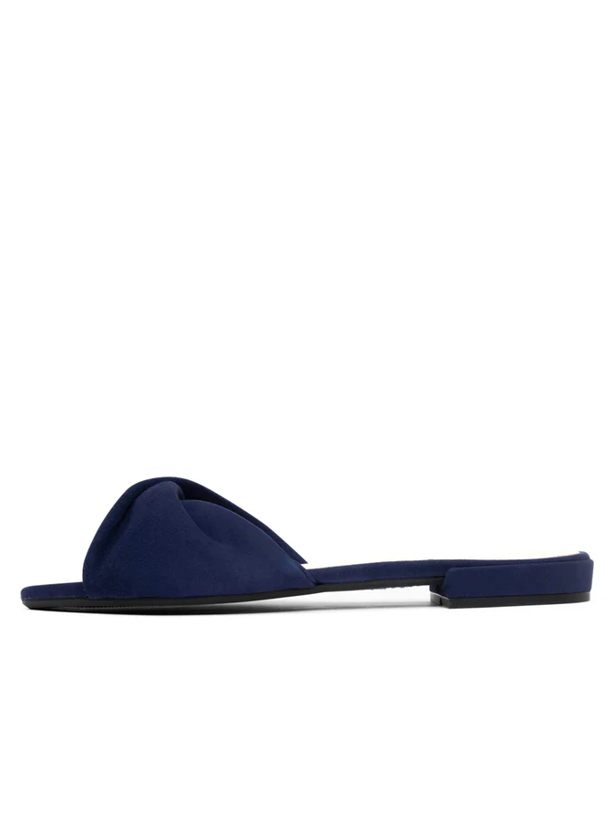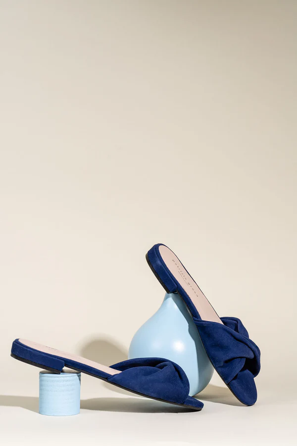 A supple suede twisted sandal that creates a V shape that elongates the leg and cradles the foot so comfortably.