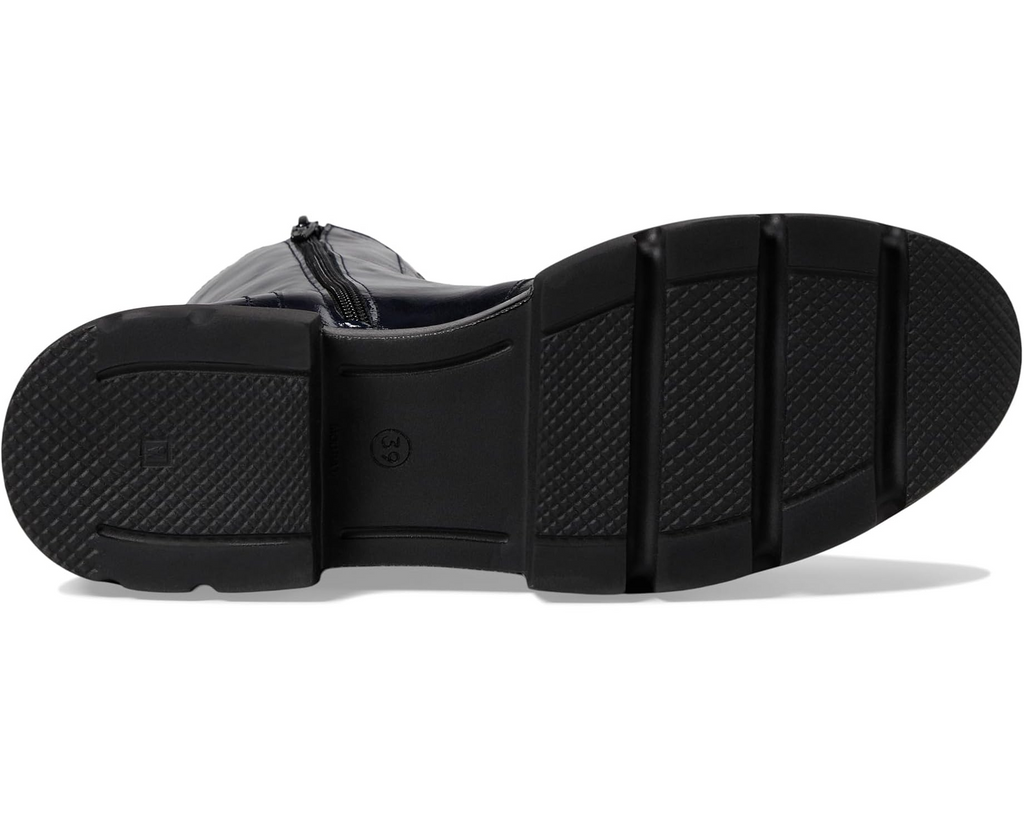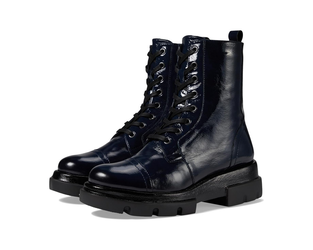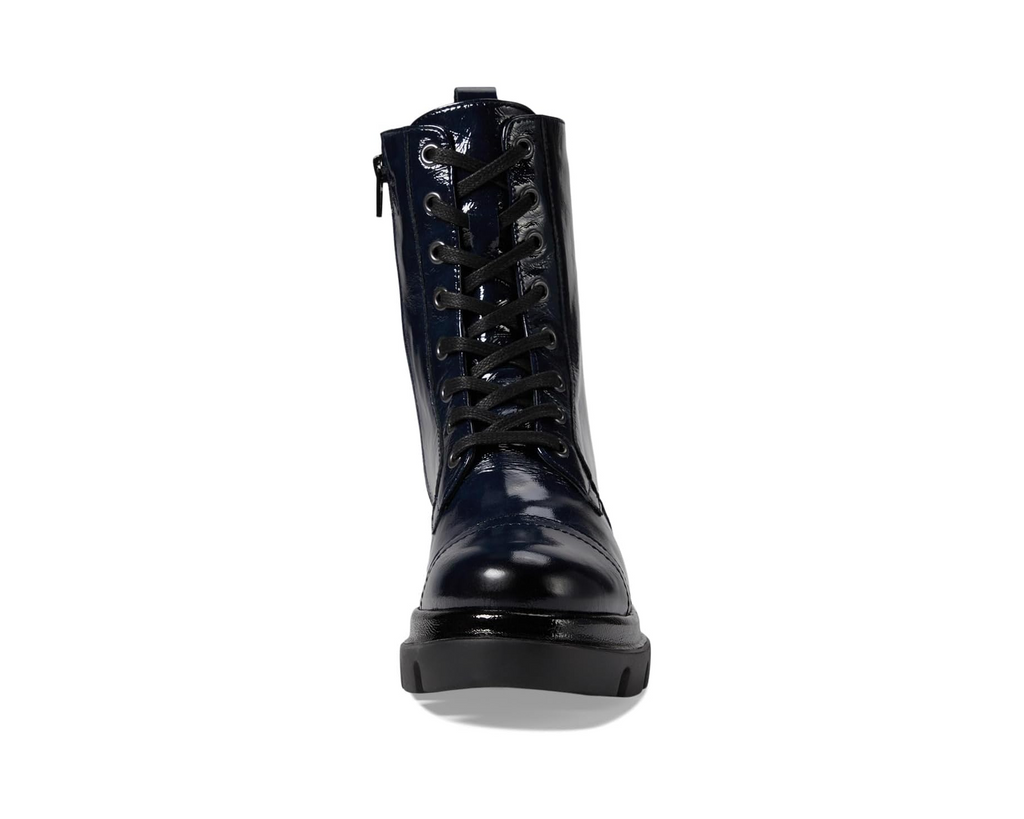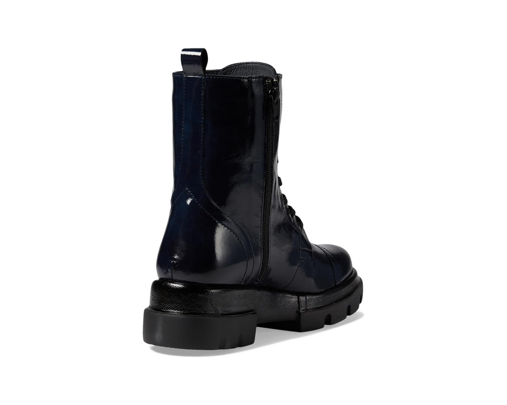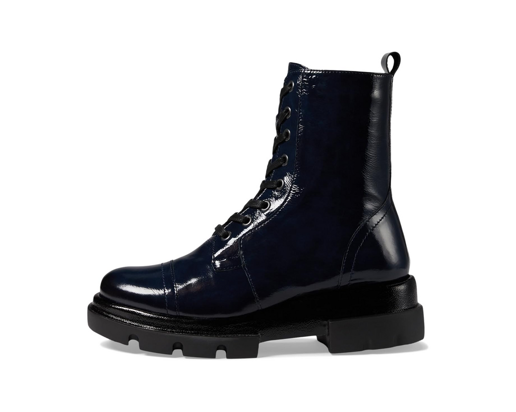 Handmade in Portugal, the Vivica by Eric Michael is a striking combat-style boot that blends edgy design with exceptional craftsmanship. Made from high-quality patent leather, this boot showcases a sleek, glossy finish that adds a modern twist to a timeless silhouette. The lace-up front ensures a secure fit, while the side zipper allows for easy on and off.