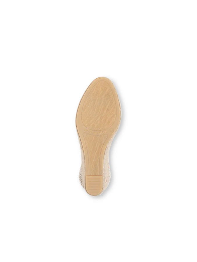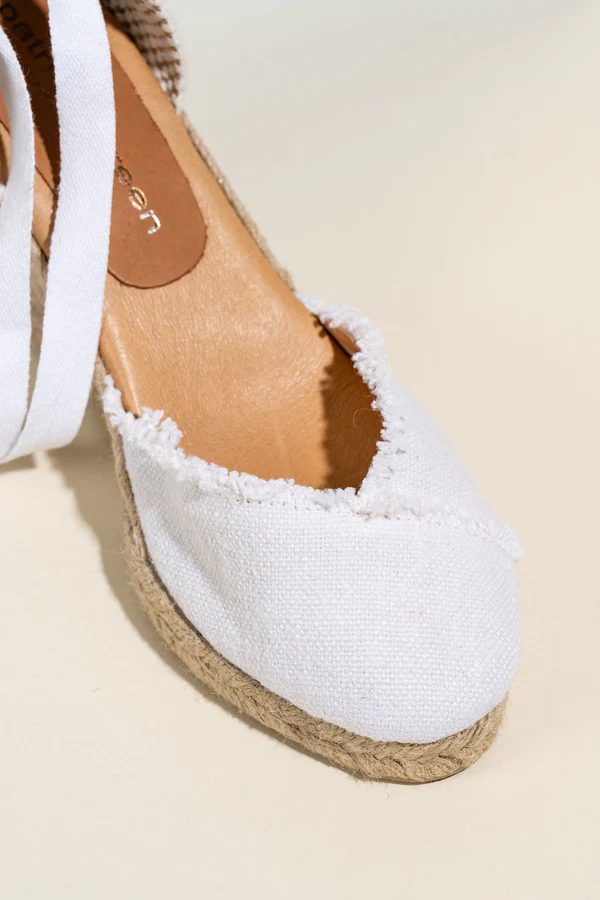 An iconic and classic jute espadrille wedge with tie, ankle wrap laces. The criss-cross frayed hem is incredibly flattering and elongating on the leg.