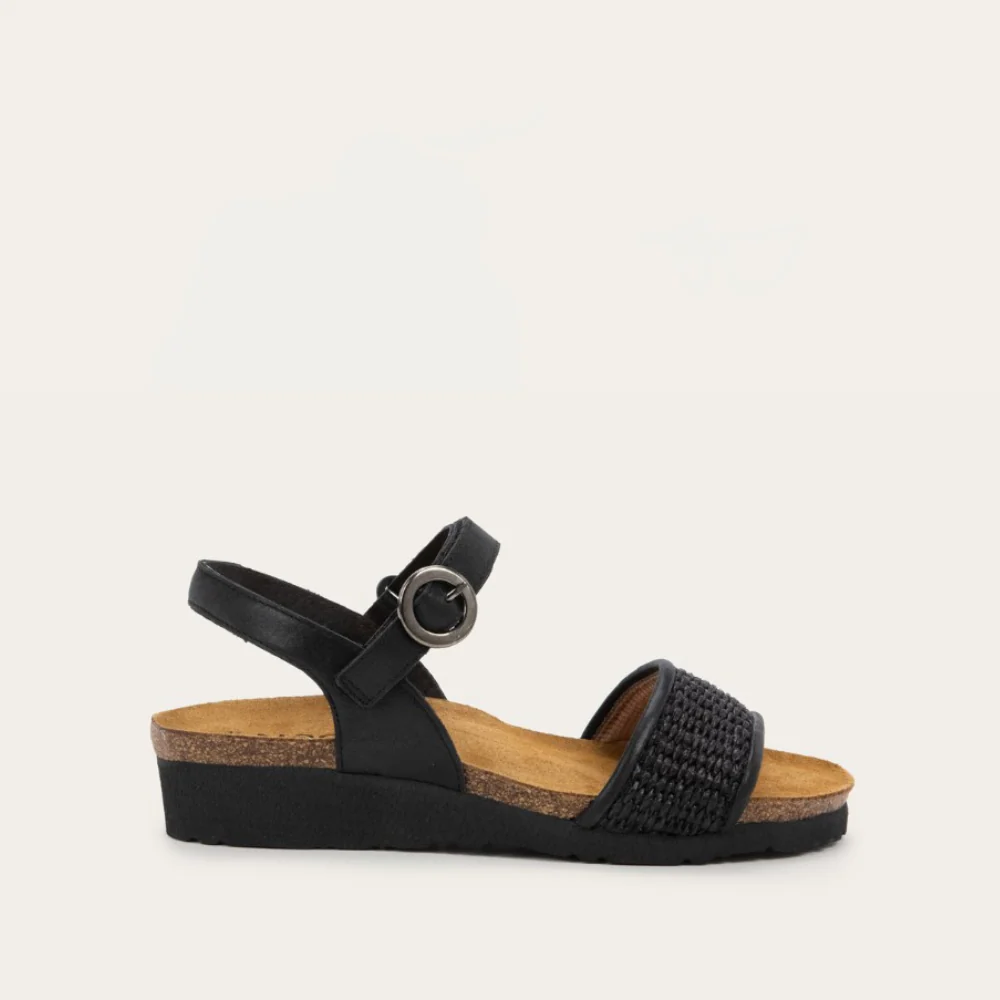 Meet Cecile - the perfect harmony of comfort and elegance. This backstrap sandal boasts a chic design with a faux buckle hook and loop strap and raffia detailing on the front strap, adding a touch of natural charm to any ensemble. The adjustable closure provides ease and convenience, ensuring you never have to sacrifice style for comfort. Cecile is the ideal choice for any occasion. Crafted with Naot's anatomic cork and latex footbed wrapped in pampering suede and molds to the shape of your foot with wear, ensuring personalized comfort. Plus, it's accepted by the American Podiatric Medical Association (APMA) for promoting good foot health. The Elegant Collection's 1.5" EVA sole offers both elegance and support.