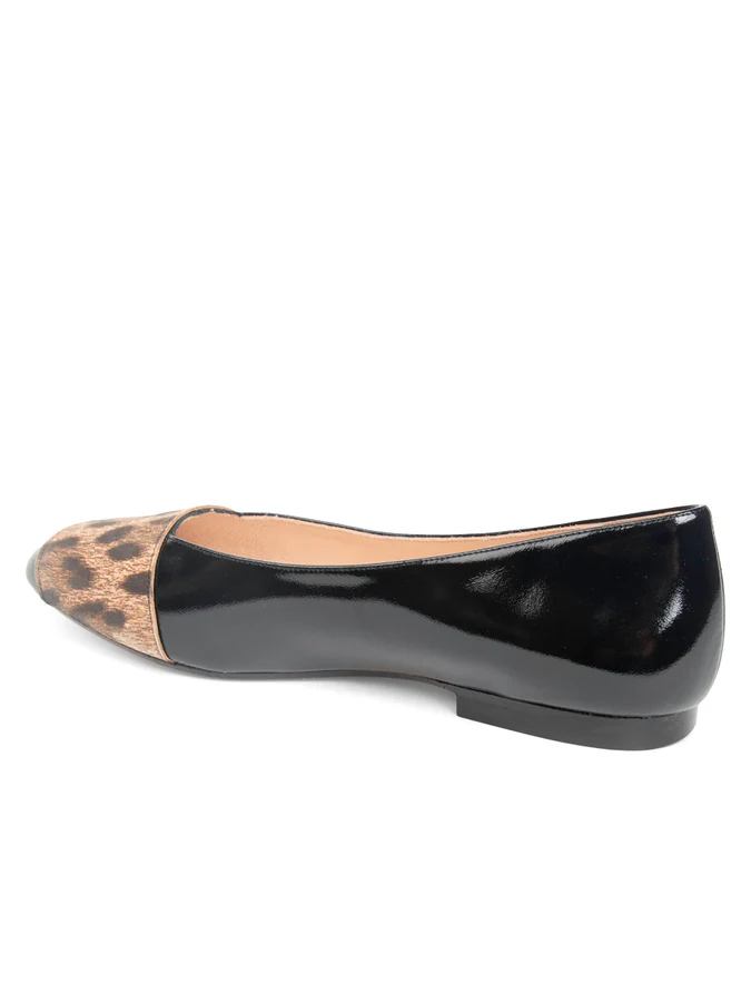 Loved for its roomier fit, wider toe box, and exceptional bunion coverage, the Milan flat delivers all-day comfort without sacrificing style. Handcrafted in Spain by a small, family-owned factory renowned for generations of shoemaking expertise, this elegant design pairs a glossy black patent body with a striking contrast toe in your choice of bold leopard print or classic grey houndstooth. So comfortable you can walk for miles, yet so chic you’ll want to wear them everywhere.