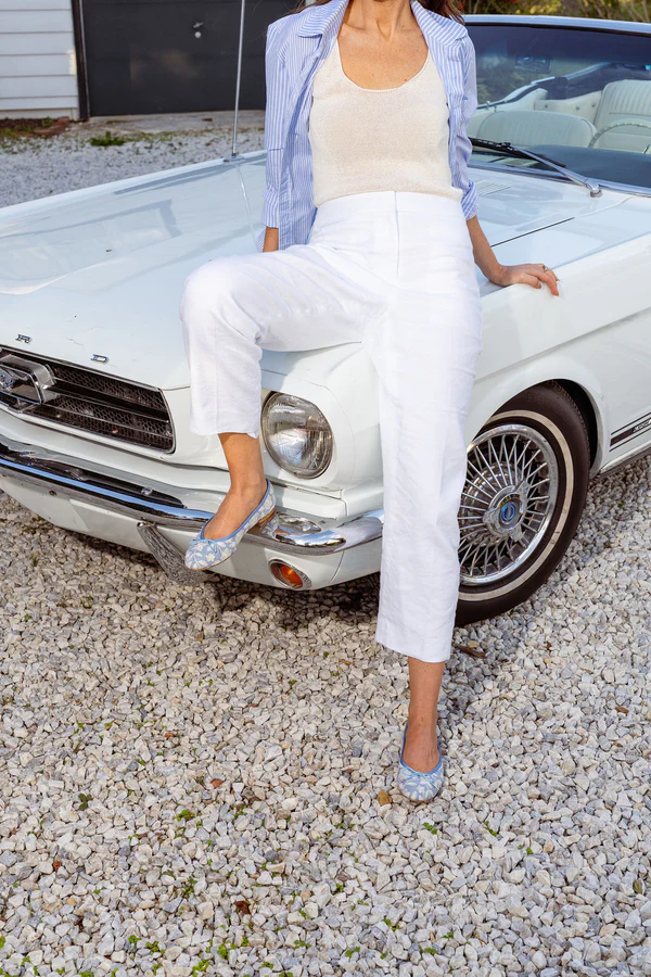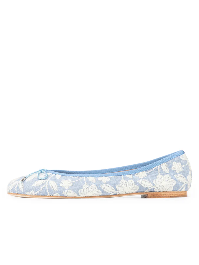 Set against a natural linen backdrop, delicate floral embroidery is stitched directly into the fabric—an authentic, hand-finished detail that brings texture, artistry, and quiet sophistication to the design. Available in serene sky blue or soft pistachio embroidery, each pair feels fresh yet enduring, perfect for women who appreciate beauty in the details. The traditional leather sole offers lightweight flexibility and a polished feel underfoot, ideal for everyday wear.