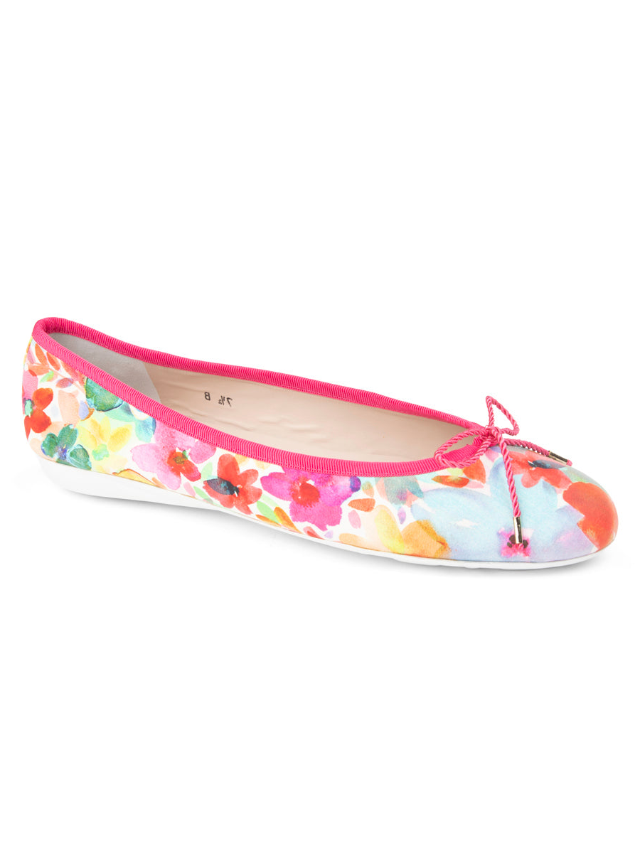 Crafted in supple leather printed with a vibrant multi-color floral motif, this style adds a fresh yet sophisticated accent to your wardrobe. Each pair is thoughtfully finished with our signature adjustable cord bow, allowing for a customized, secure fit. The flexible sole moves naturally with you, offering comfort without sacrificing refinement.
