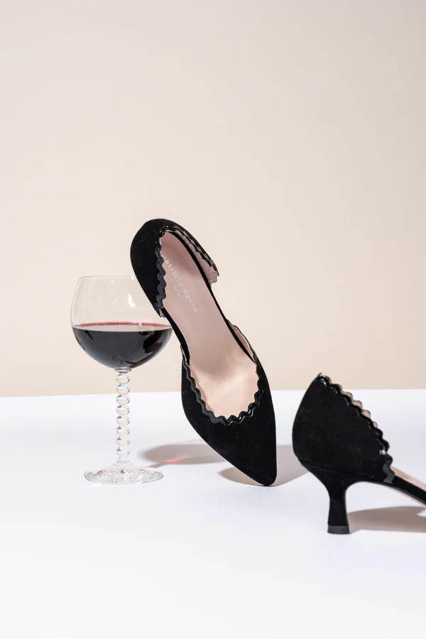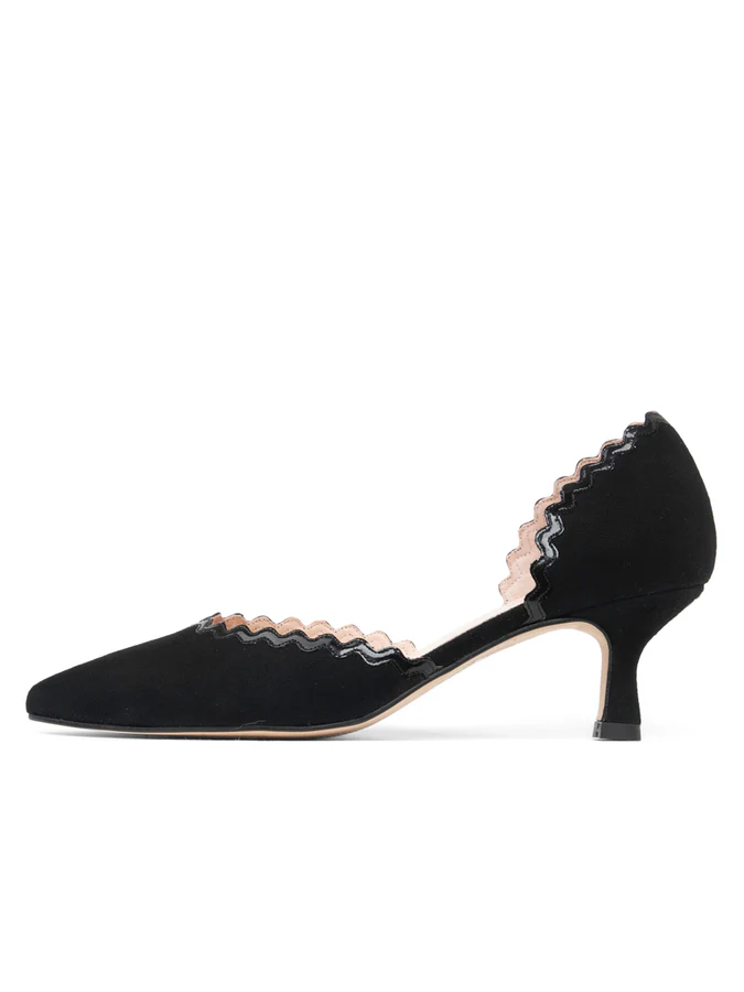 A classic d'Orsay style kitten heel with a patent leather scalloped trim.