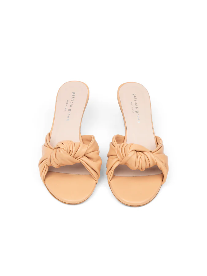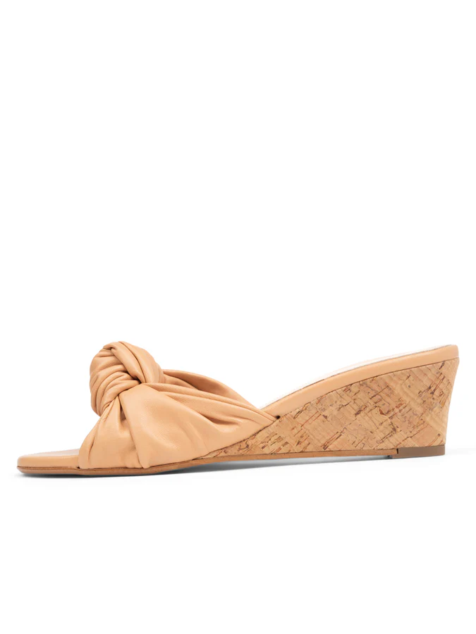 Our buttery soft European leather comfortably cradles the foot with a knotted bow-like detail. Sitting atop a low cork wedge, for shock absorbing comfort that's easy to walk in for miles on end. We love a wedge like this for outdoor weddings, picnics, etc to give you a stable flat ground so you aren't sinking in the grass in your heels!