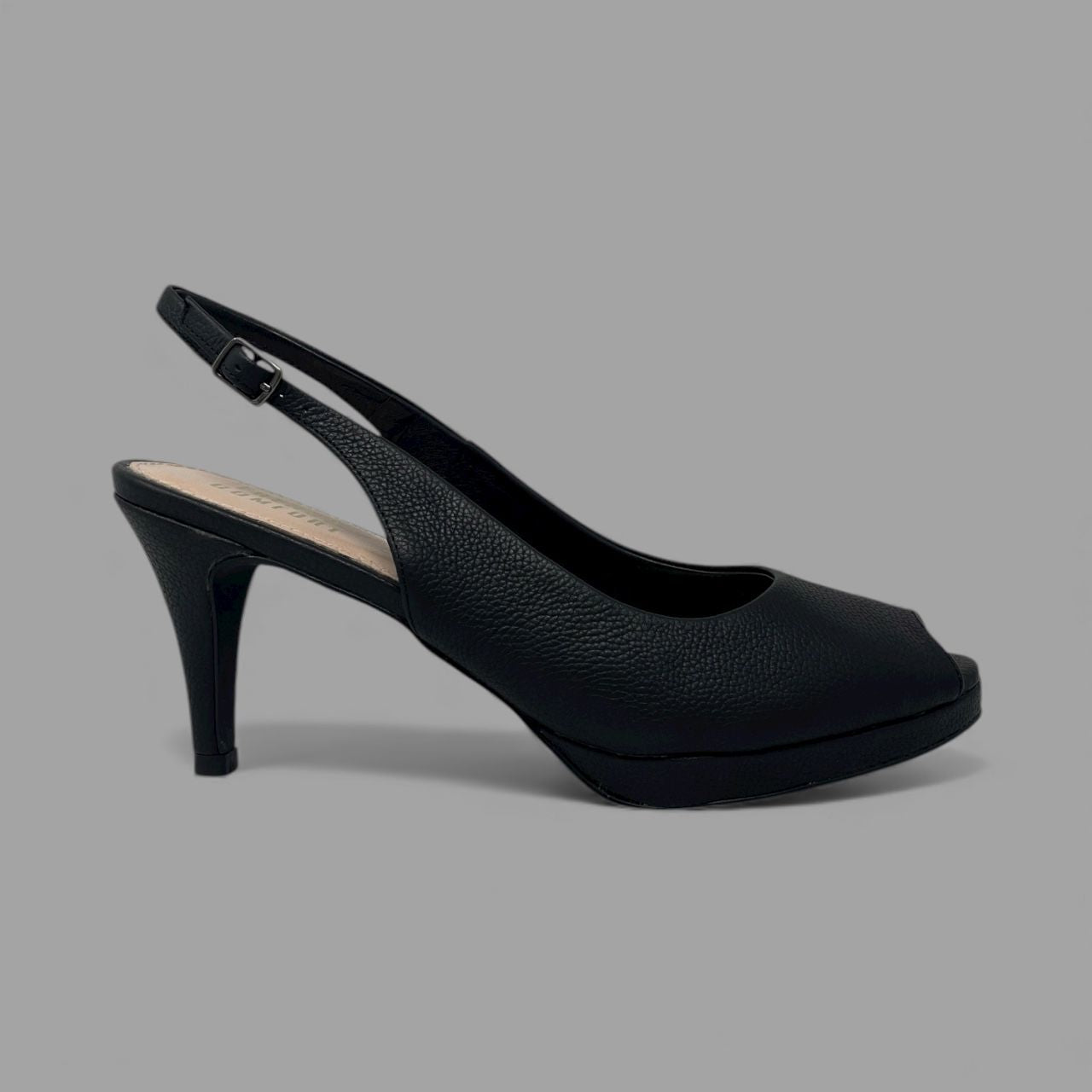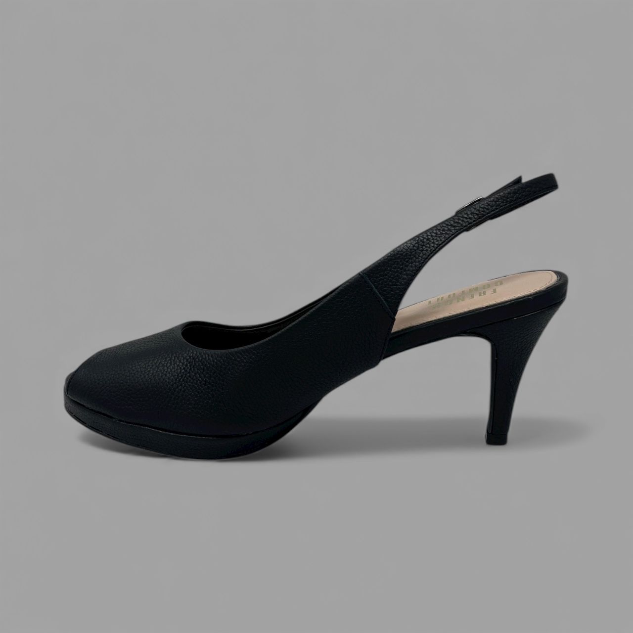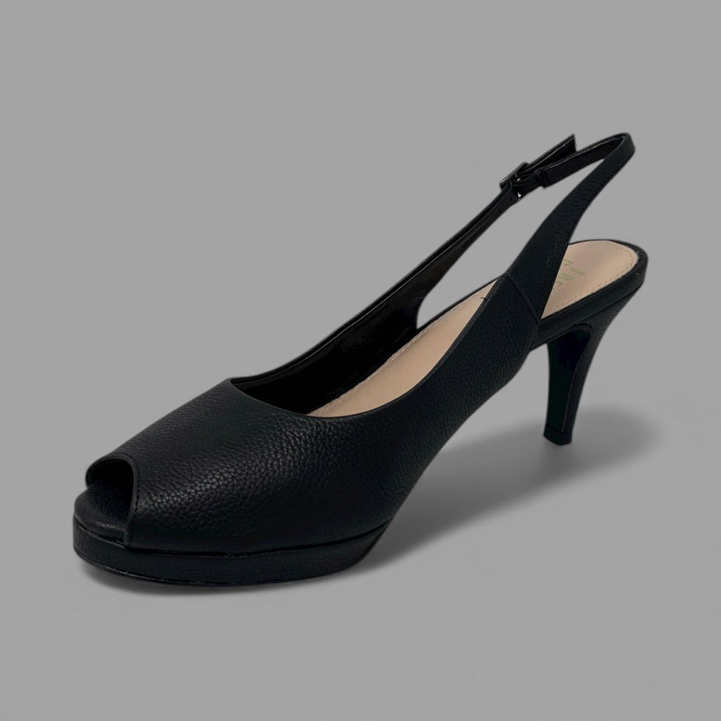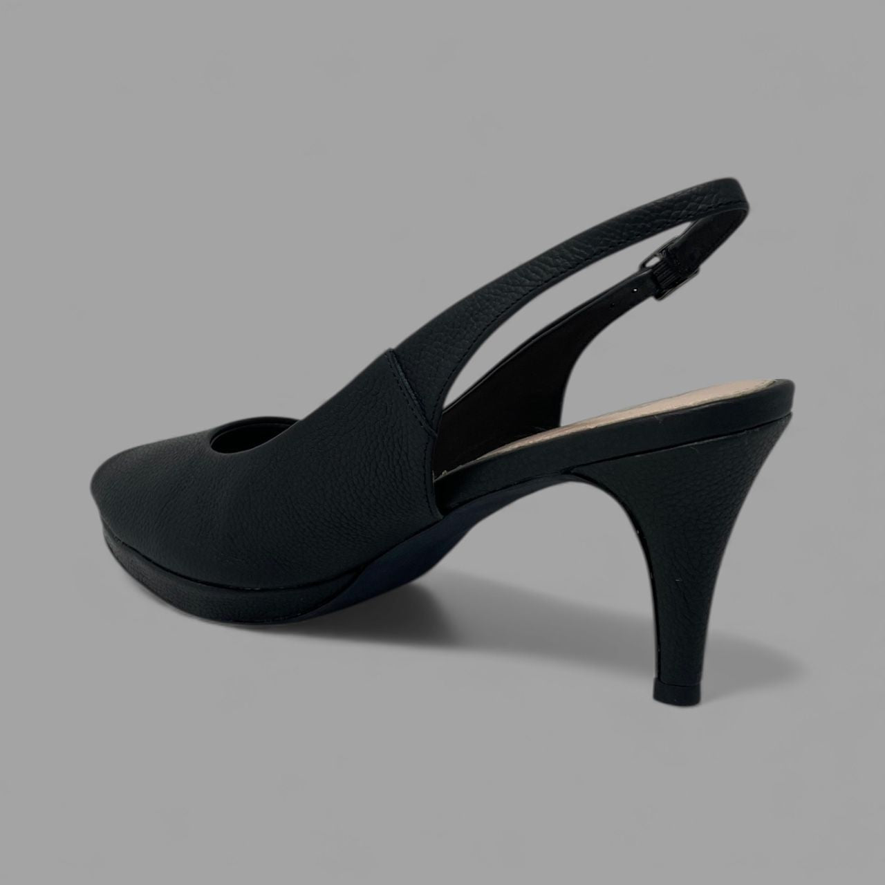 A slender, comfortable covered heel offers graceful height, balanced by a hidden front platform that reduces the pitch for enhanced wearability. The adjustable slingback strap ensures a secure and polished fit, completing this essential, versatile pump.