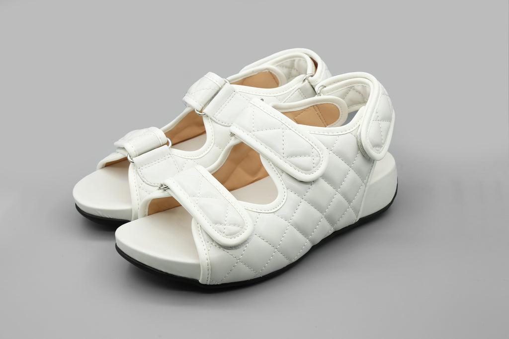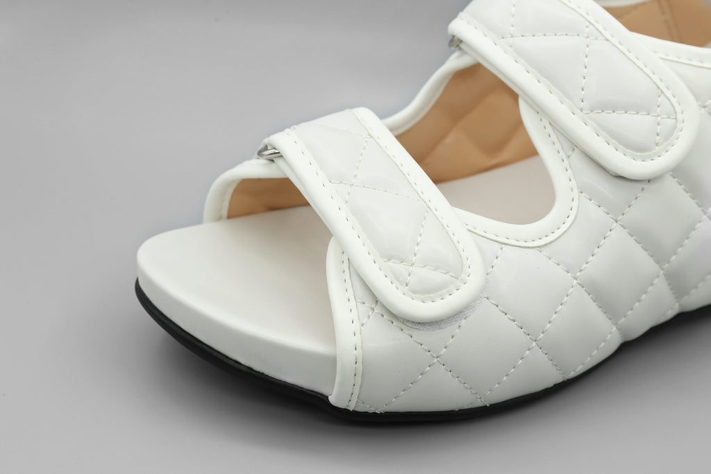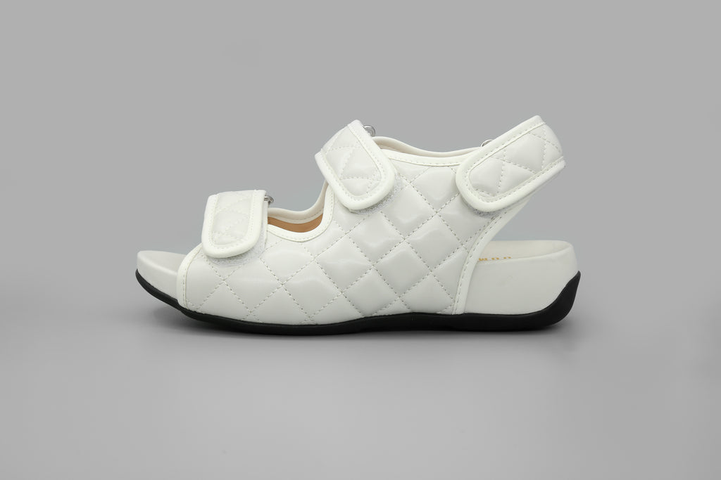 The upper features soft, plush diamond-quilted leather straps that provide both texture and structure. With three fully adjustable hook-and-loop closures—at the forefoot, midfoot, and ankle—you can achieve a secure and customized fit perfect for walking and active days.