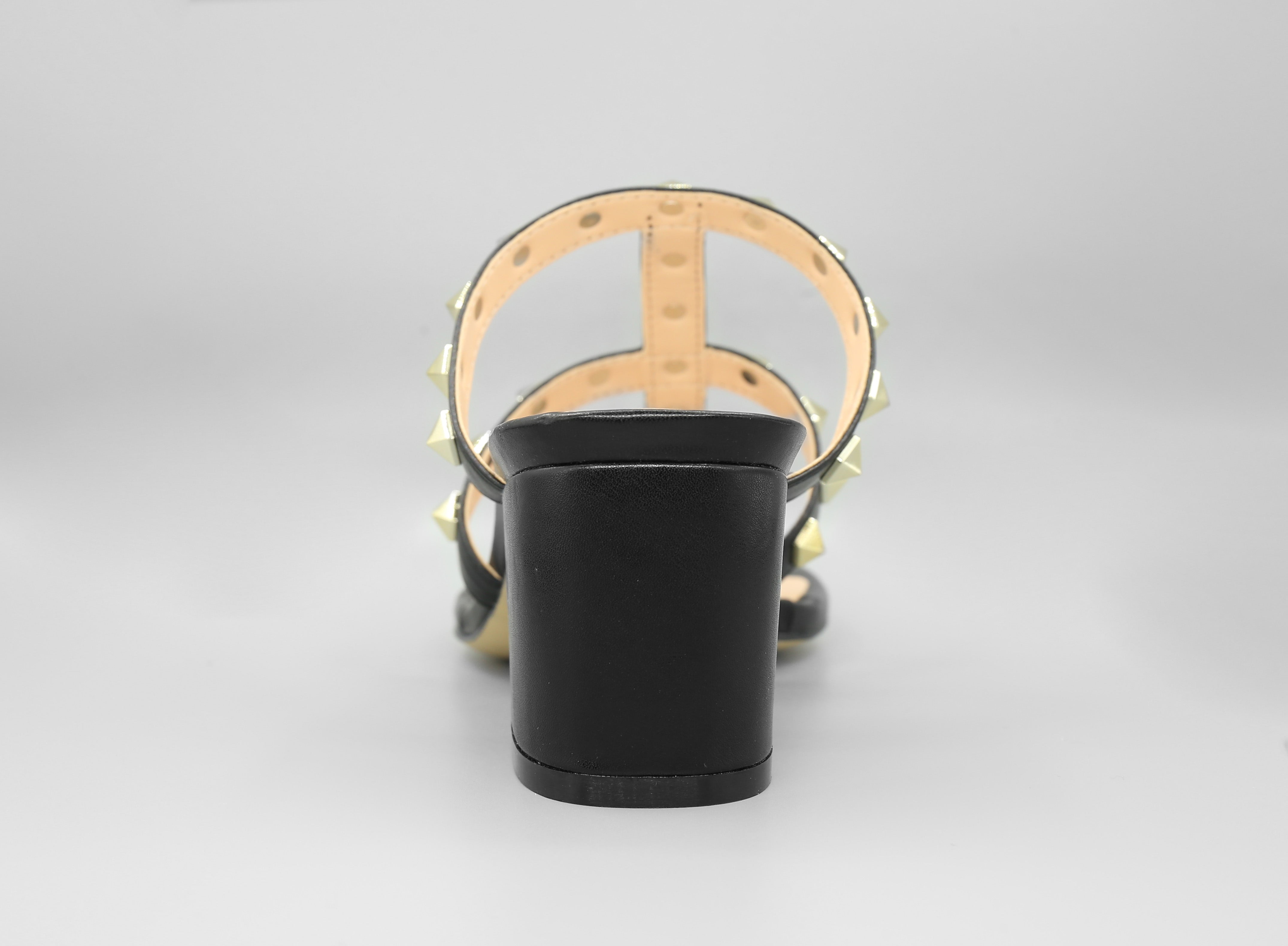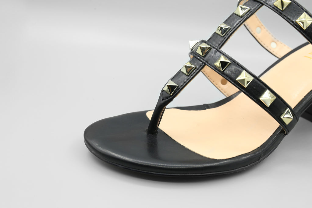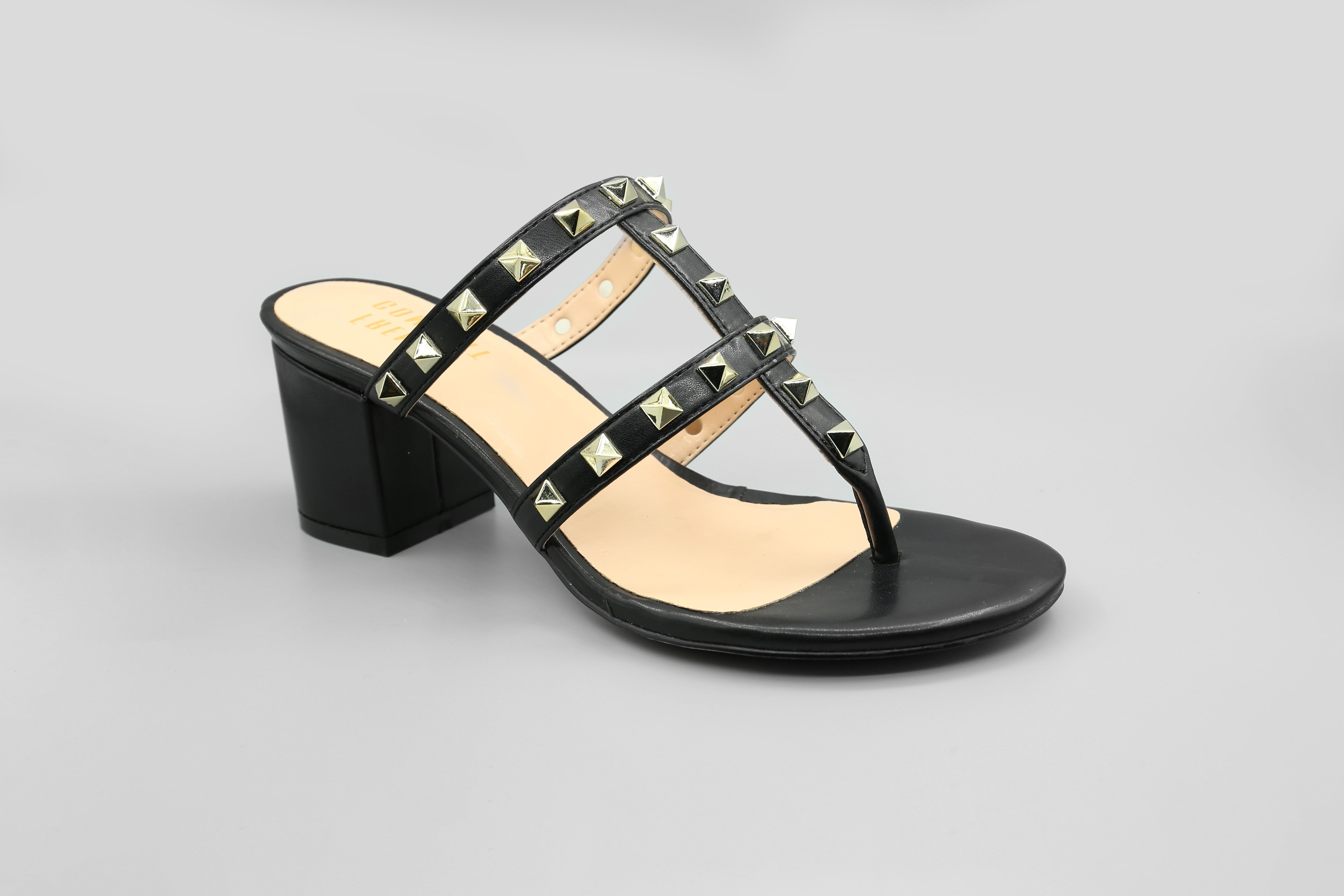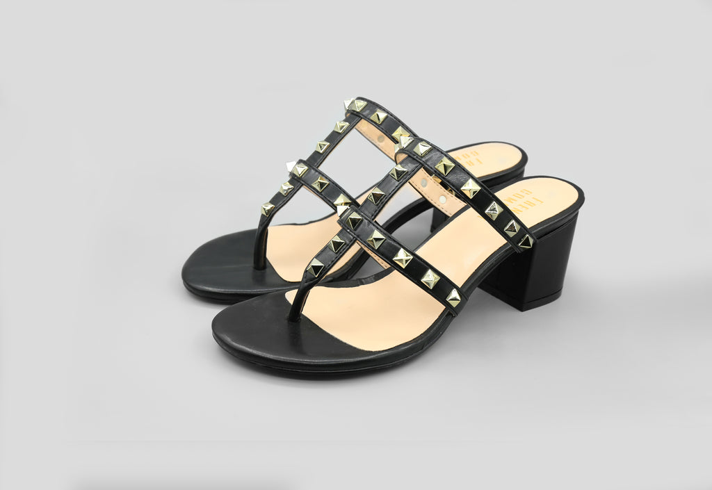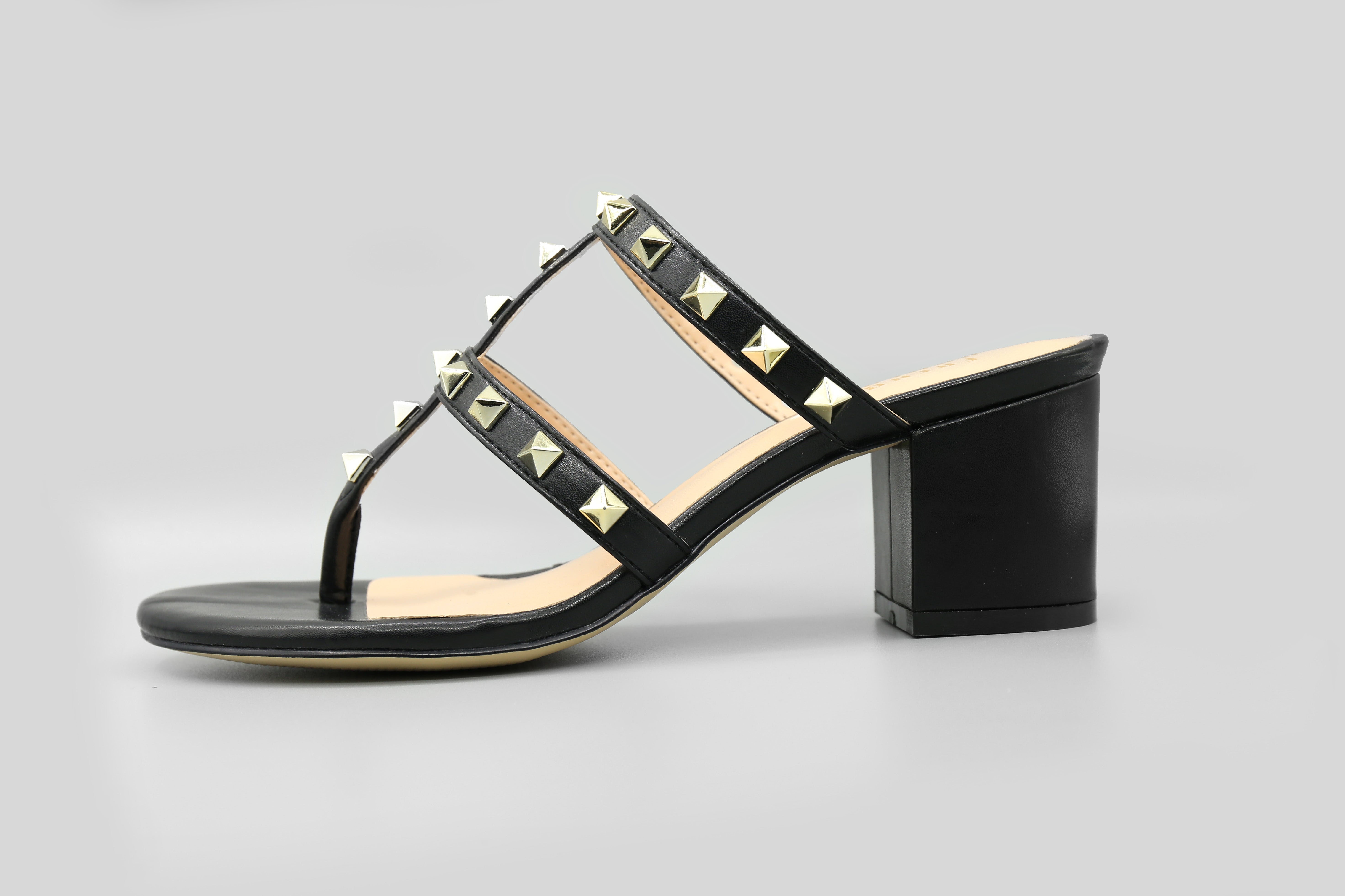 The Flora mule blends effortless slip-on style with a confident, edgy detail. This thong-style slide is defined by its two slender vamp straps, which are beautifully embellished with polished gold-toned pyramid studs, adding a chic, rock-and-roll inspired texture.