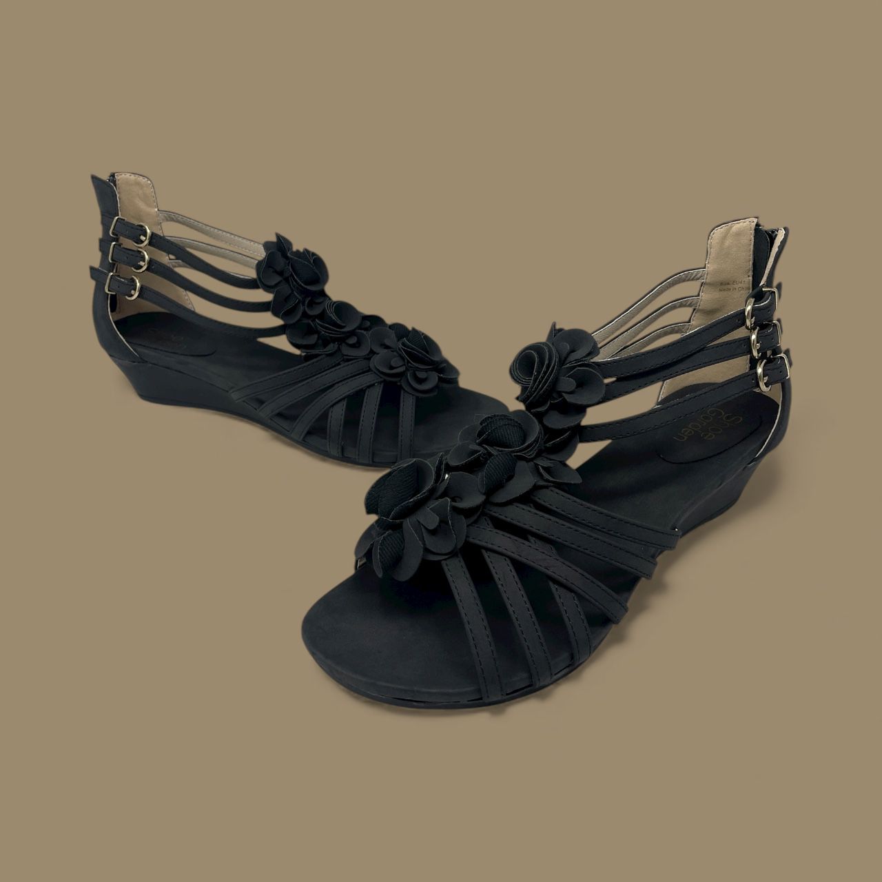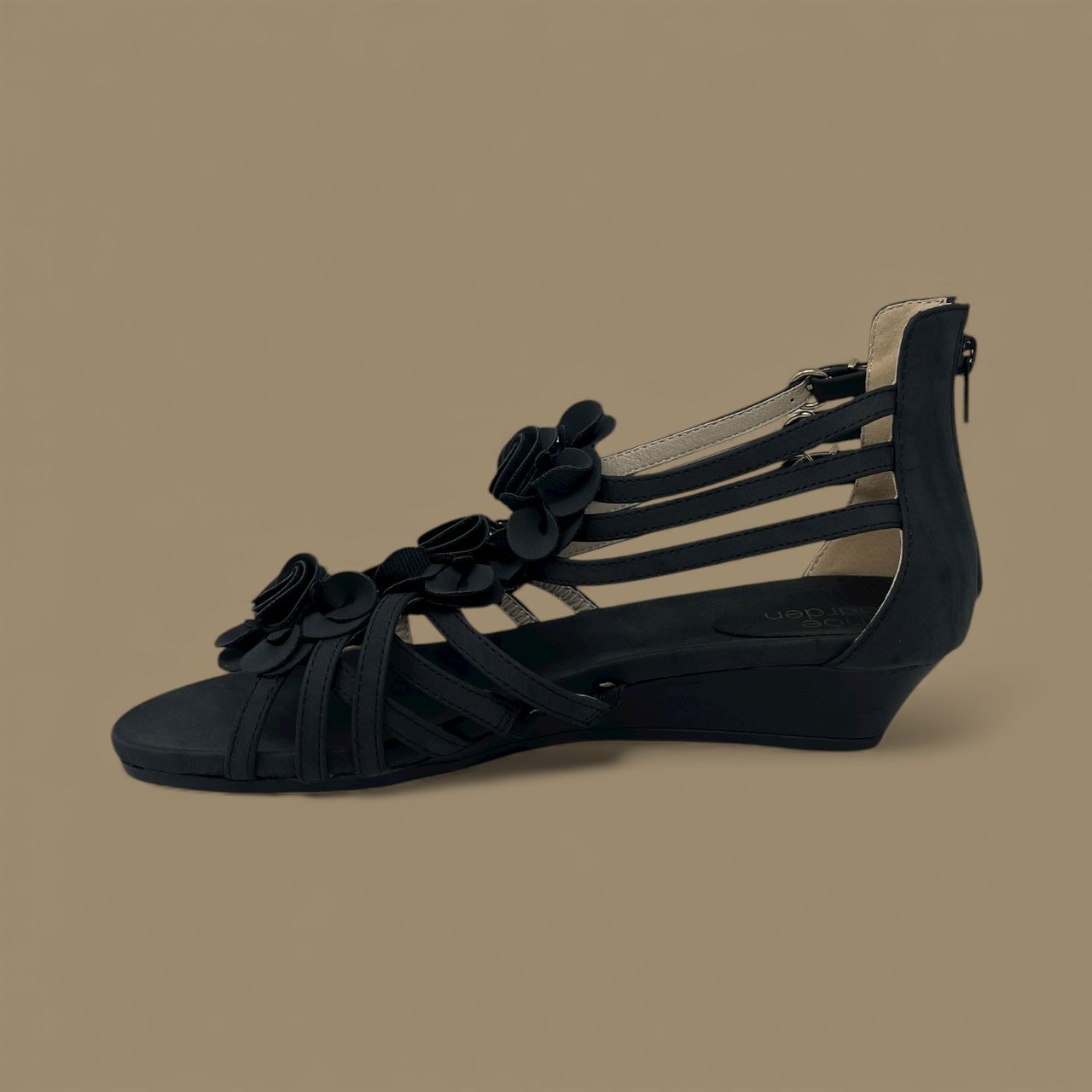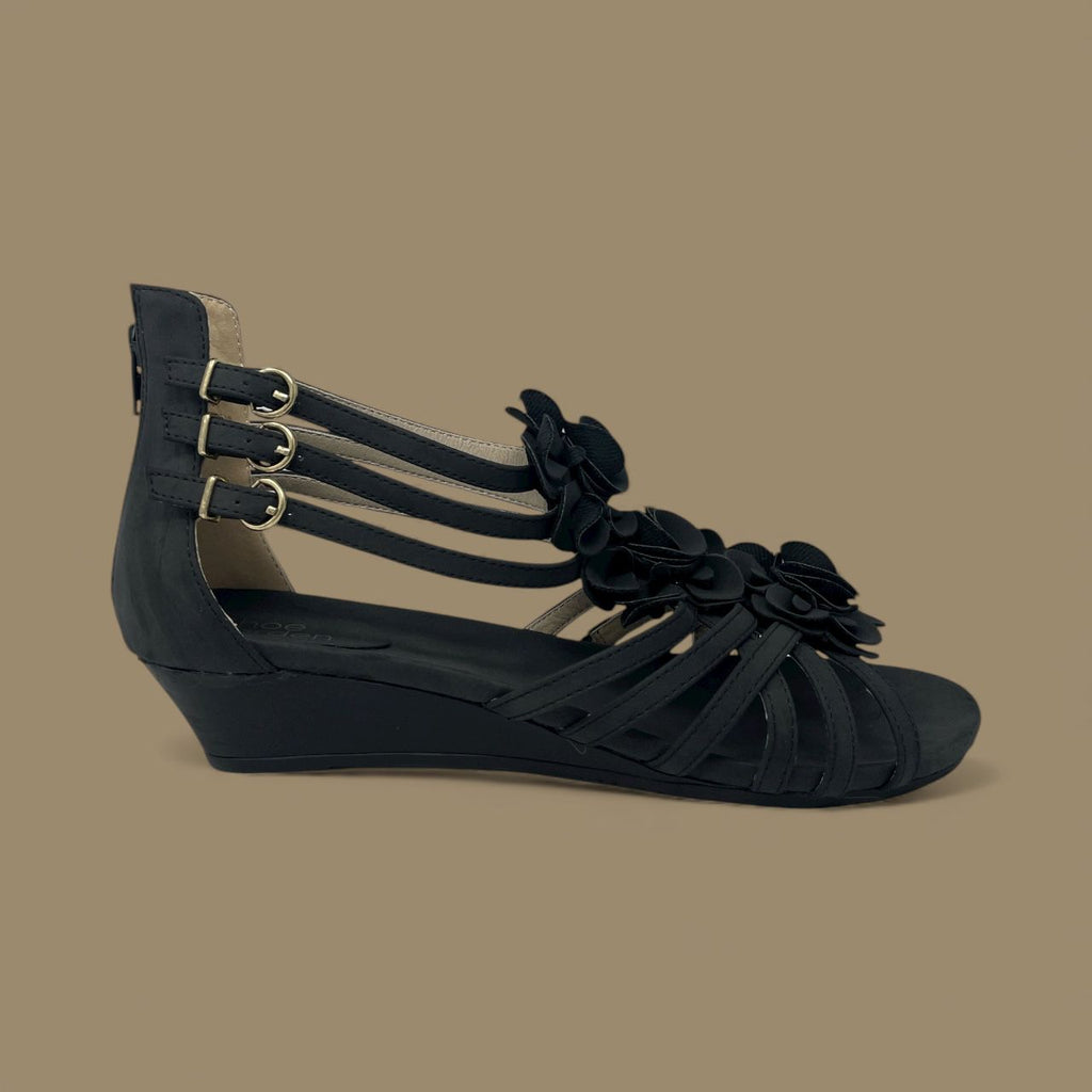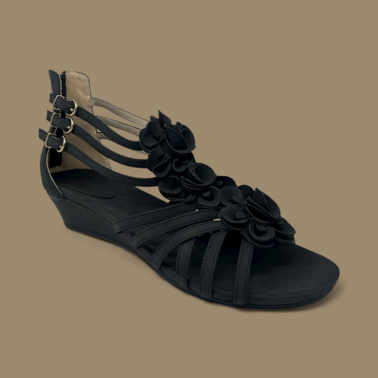 Its centerpiece is the cascade of three-dimensional flower appliqués that trail gracefully across the instep, adding an enchanting texture. A slight, comfortable wedge elevates the foot, while the back zipper and decorative buckles ensure an easy on-and-off experience and a secure fit for graceful movement.