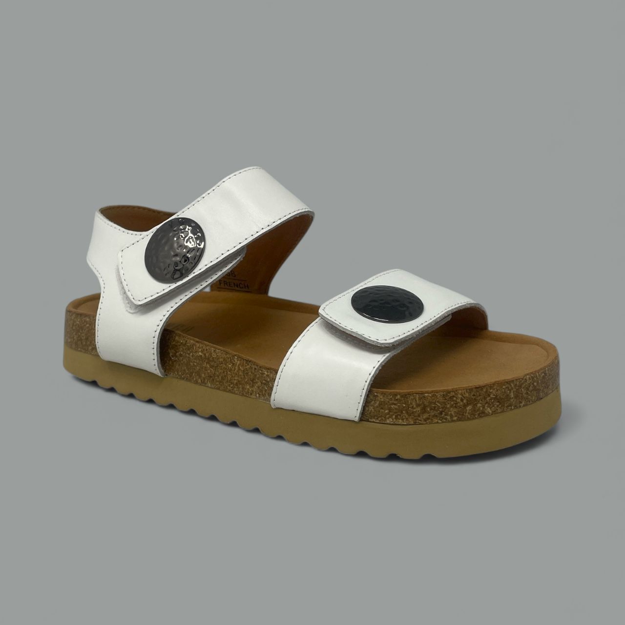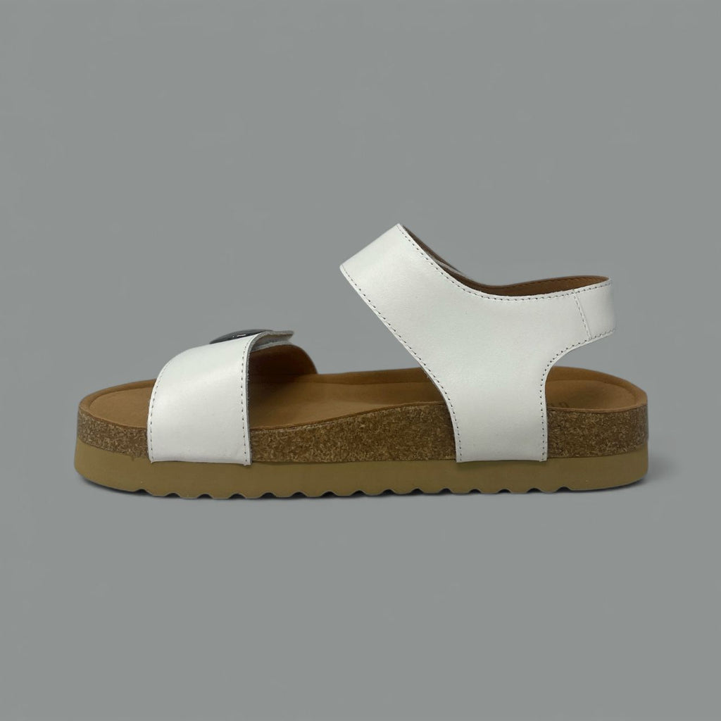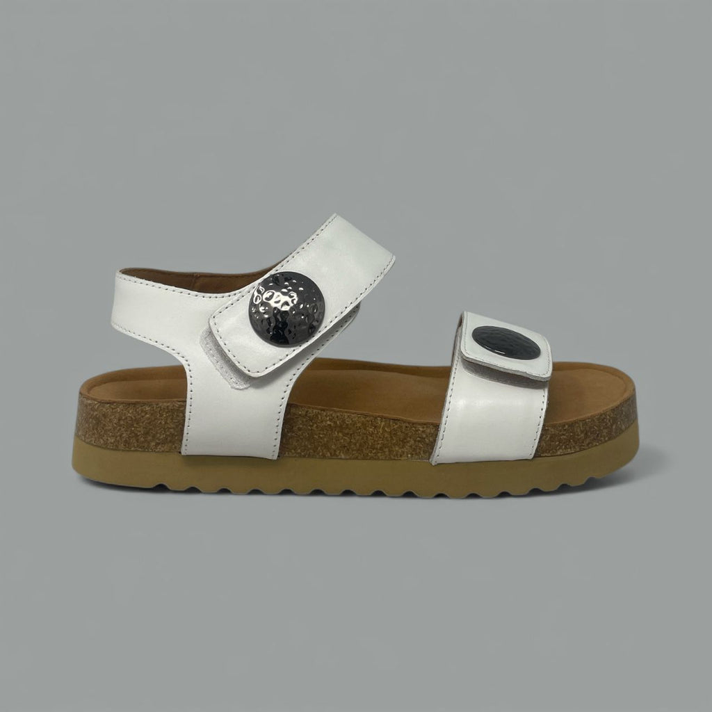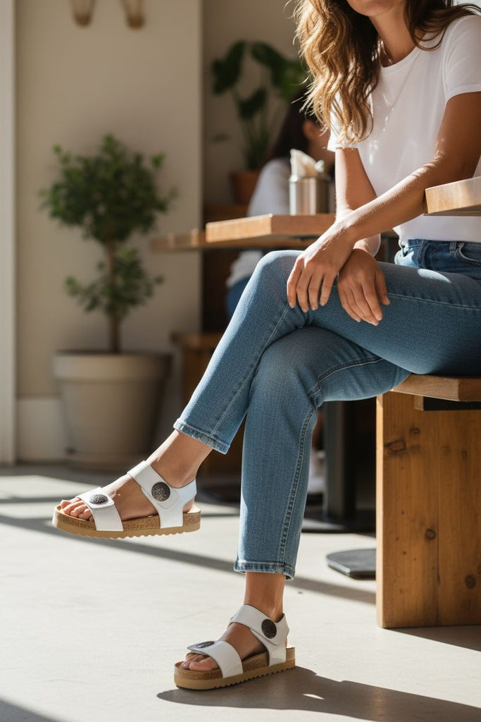 Crafted with genuine leather straps, this sandal features wide, adjustable closures secured by distinct, polished black buttons at the forefoot and ankle, ensuring a perfectly customized and stable fit. The adjustable straps allow for quick, easy adjustments throughout your day.