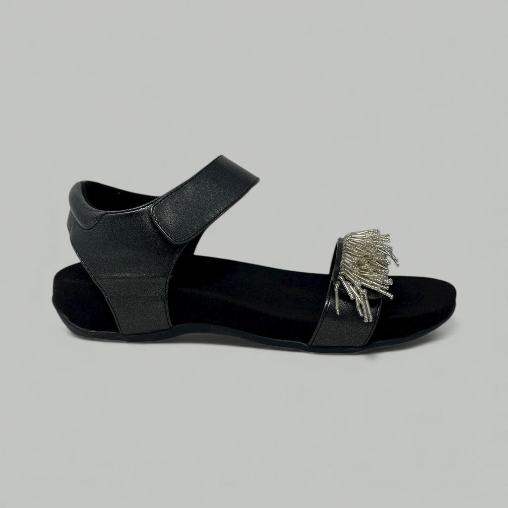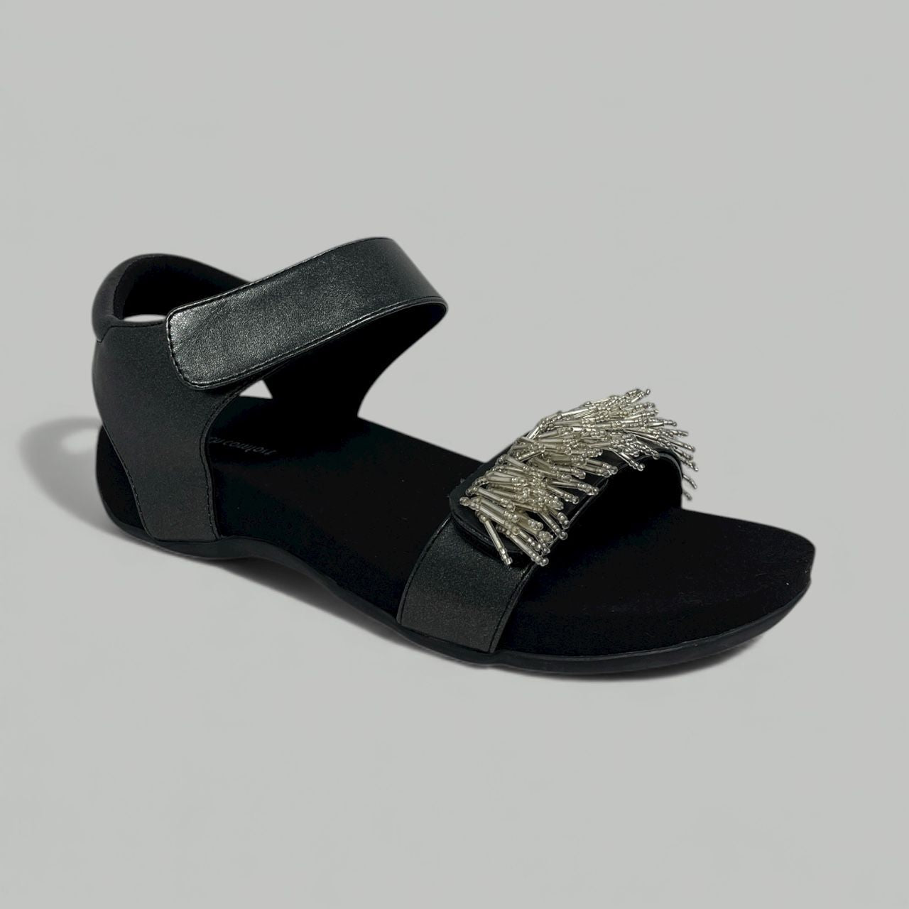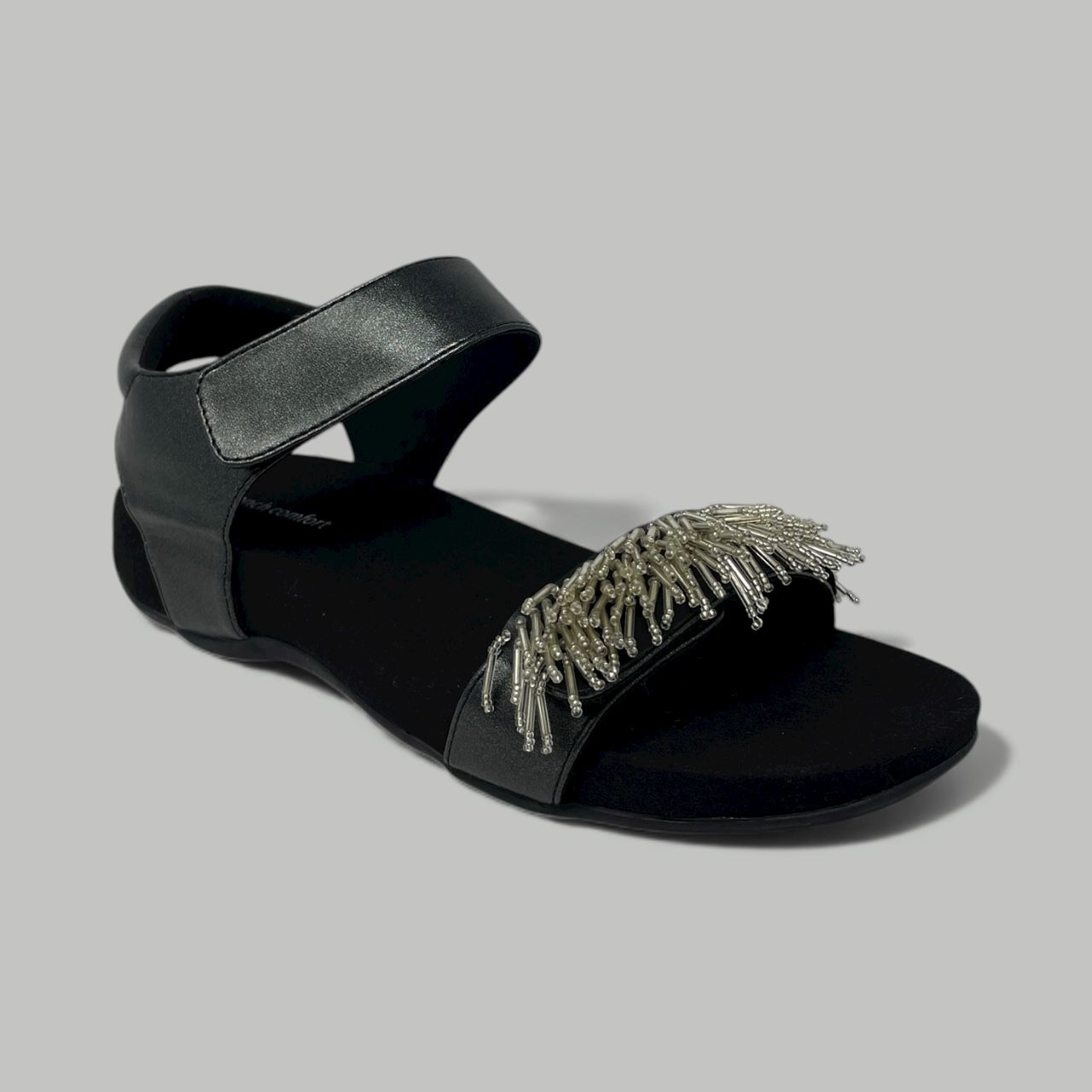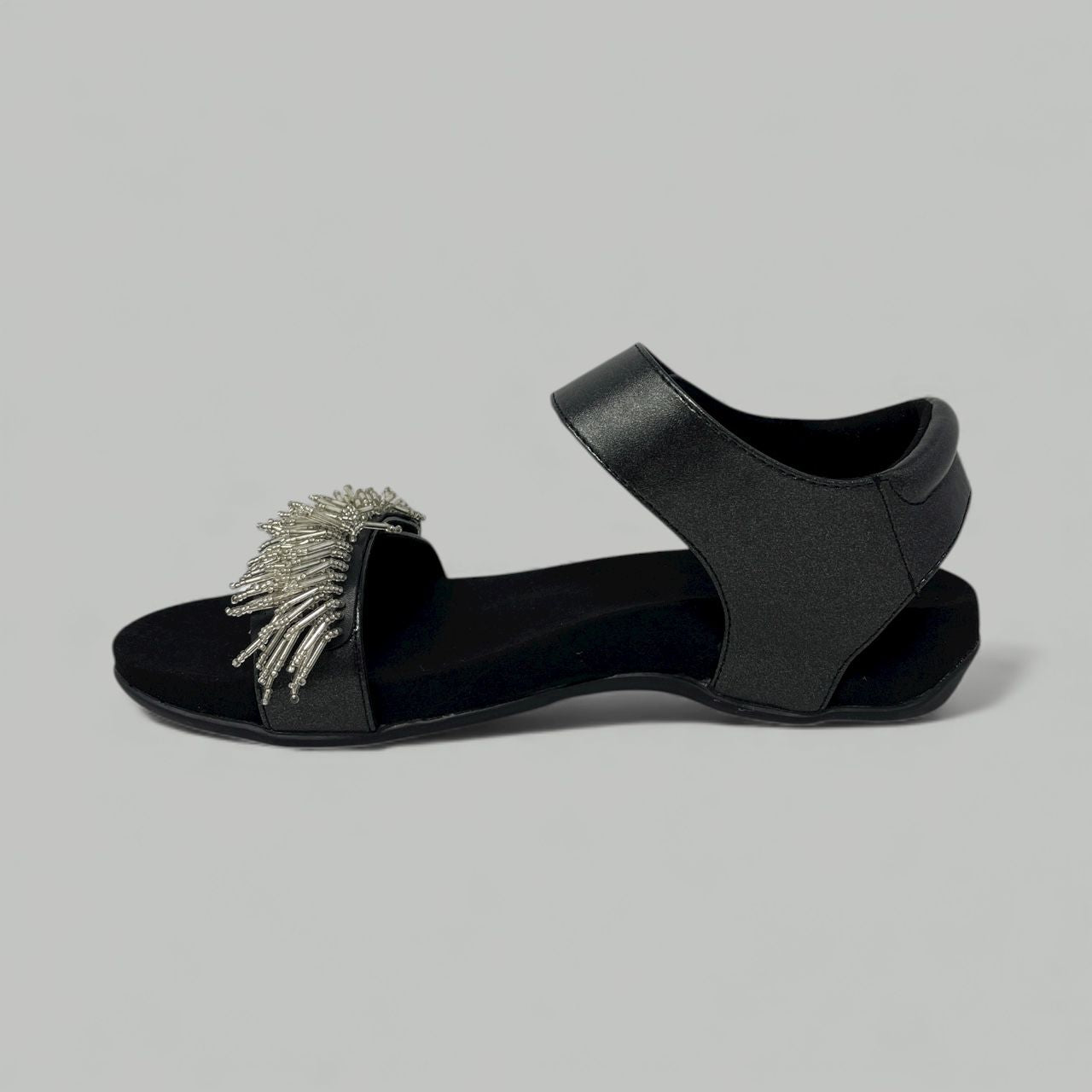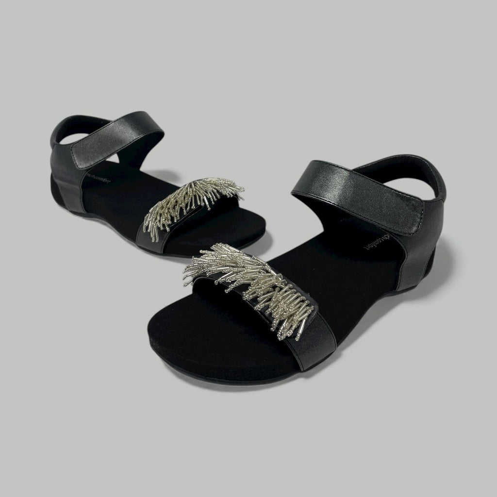 The focal point is the magnificent hand-applied silver beadwork detailing the wide forefoot strap, designed to catch the light beautifully with every step. The rest of the upper is crafted from a sleek black material that provides a polished contrast to the metallic embellishment.