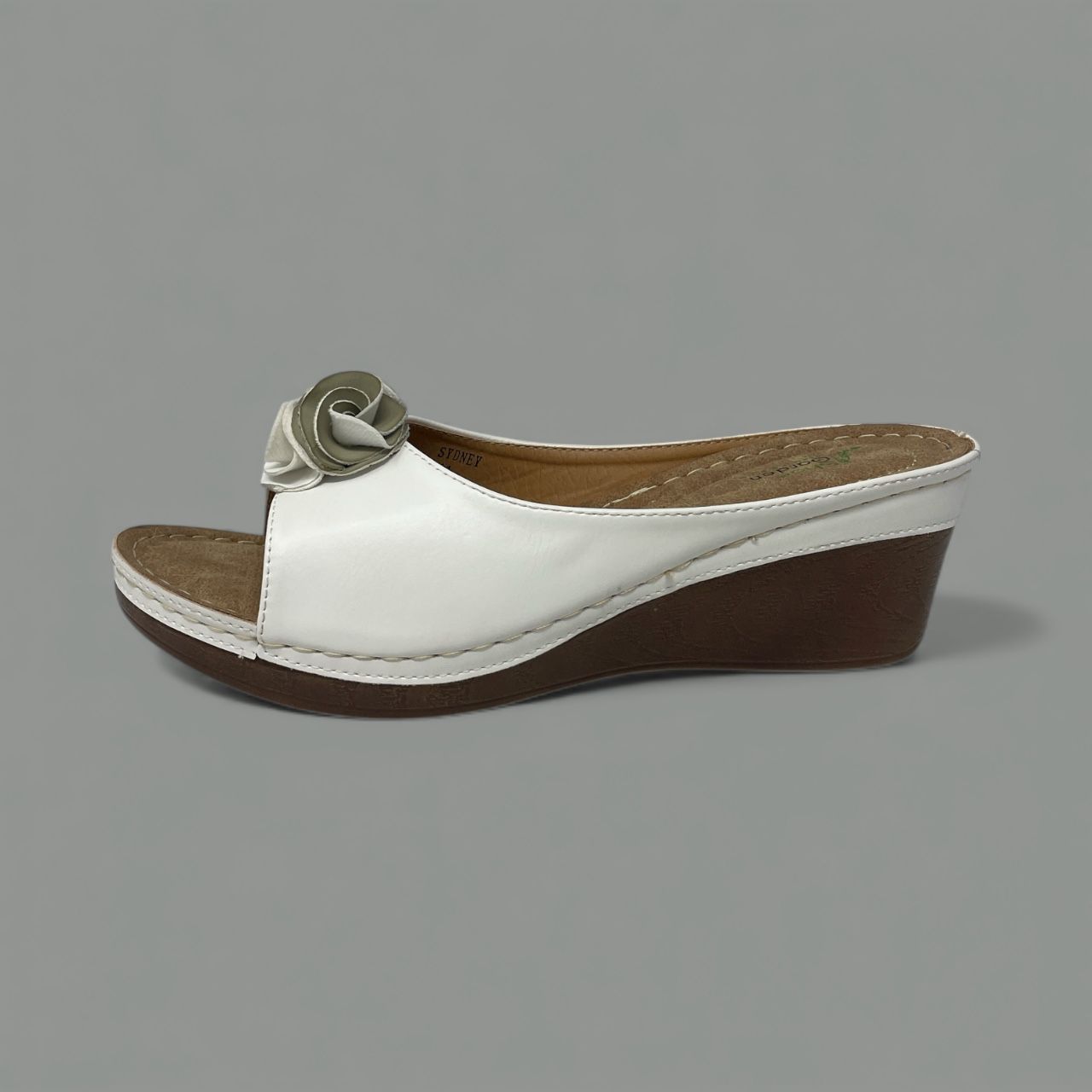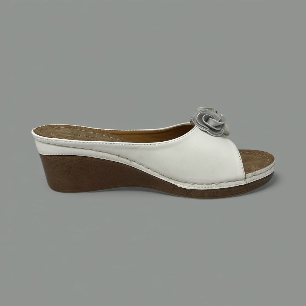 The Sydney slide is the perfect casual wedge for sunny days, blending effortless style with all-day wearability. The smooth upper, available in crisp white or classic white, is set off by a charming three-dimensional leather flower appliqué nestled near the toe.