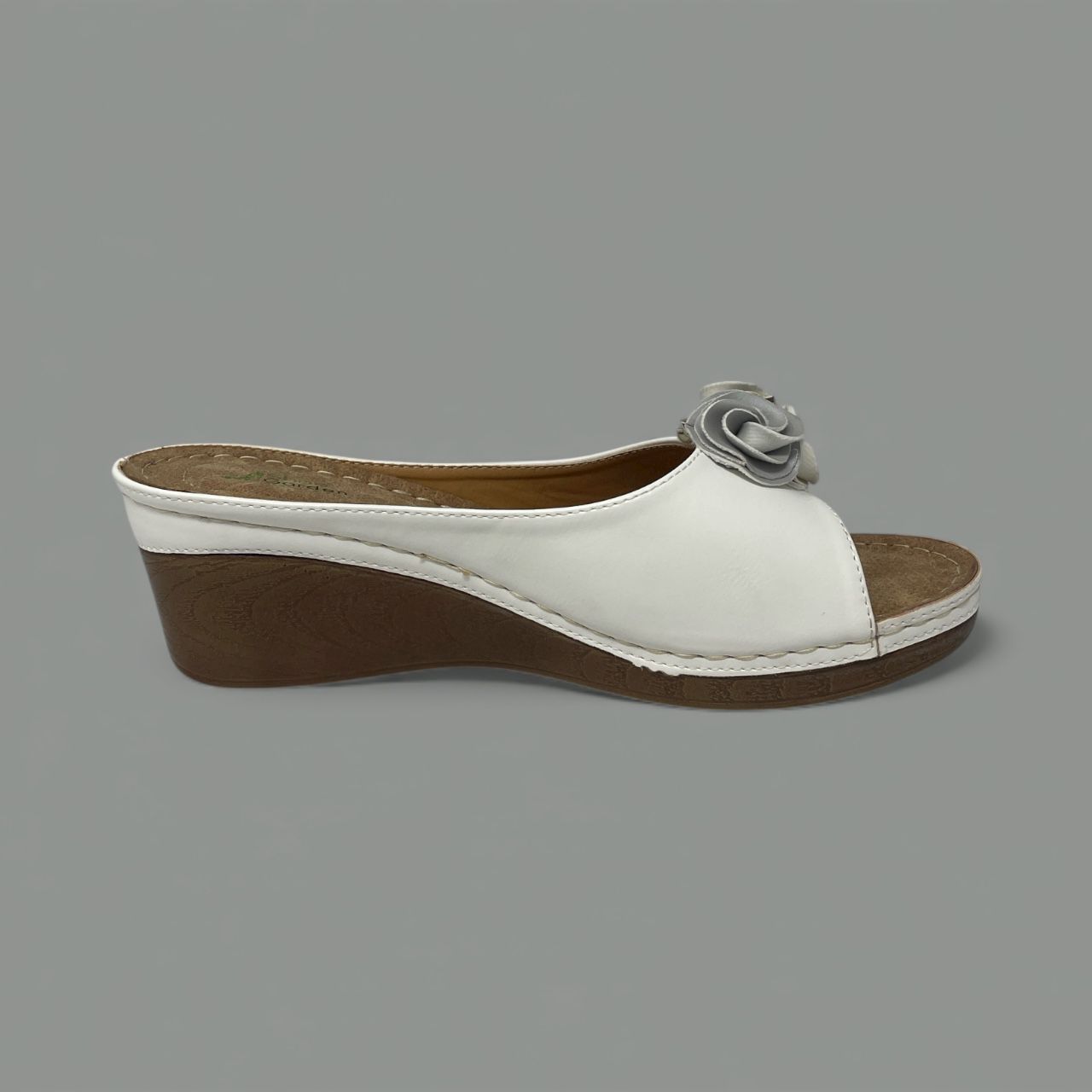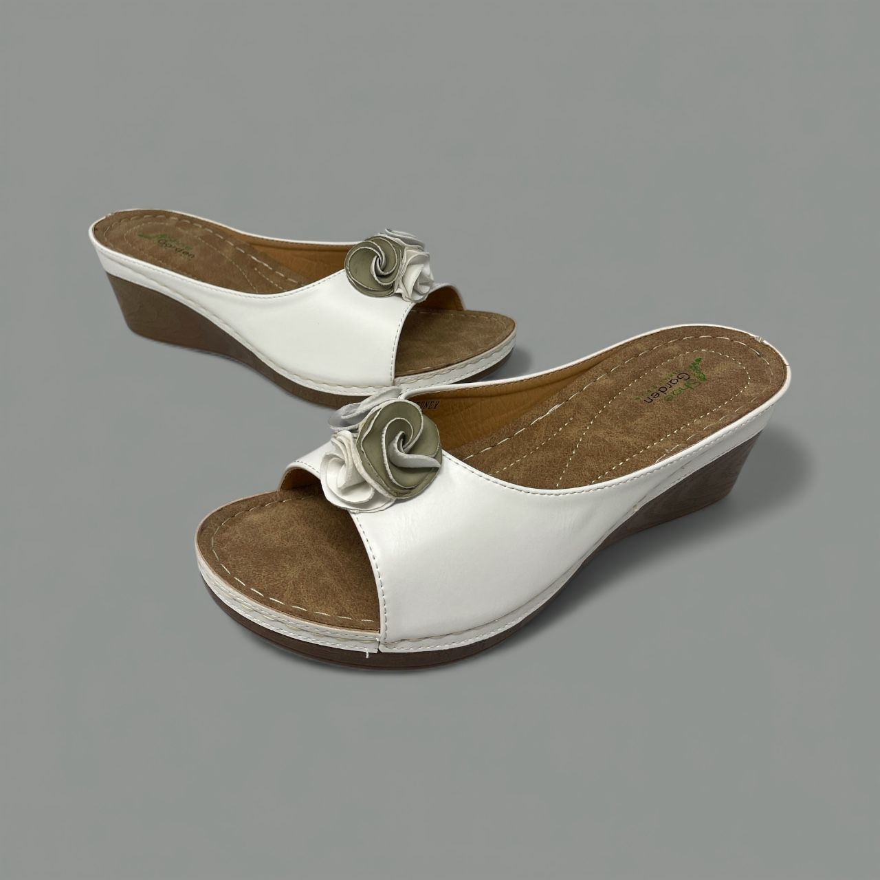 Designed for ease, this slip-on style features a comfortable open toe and a textured footbed that cradles the foot. The substantial wood-effect wedge heel provides gentle elevation and stability, while the contrast stitching along the sole highlights the careful construction.