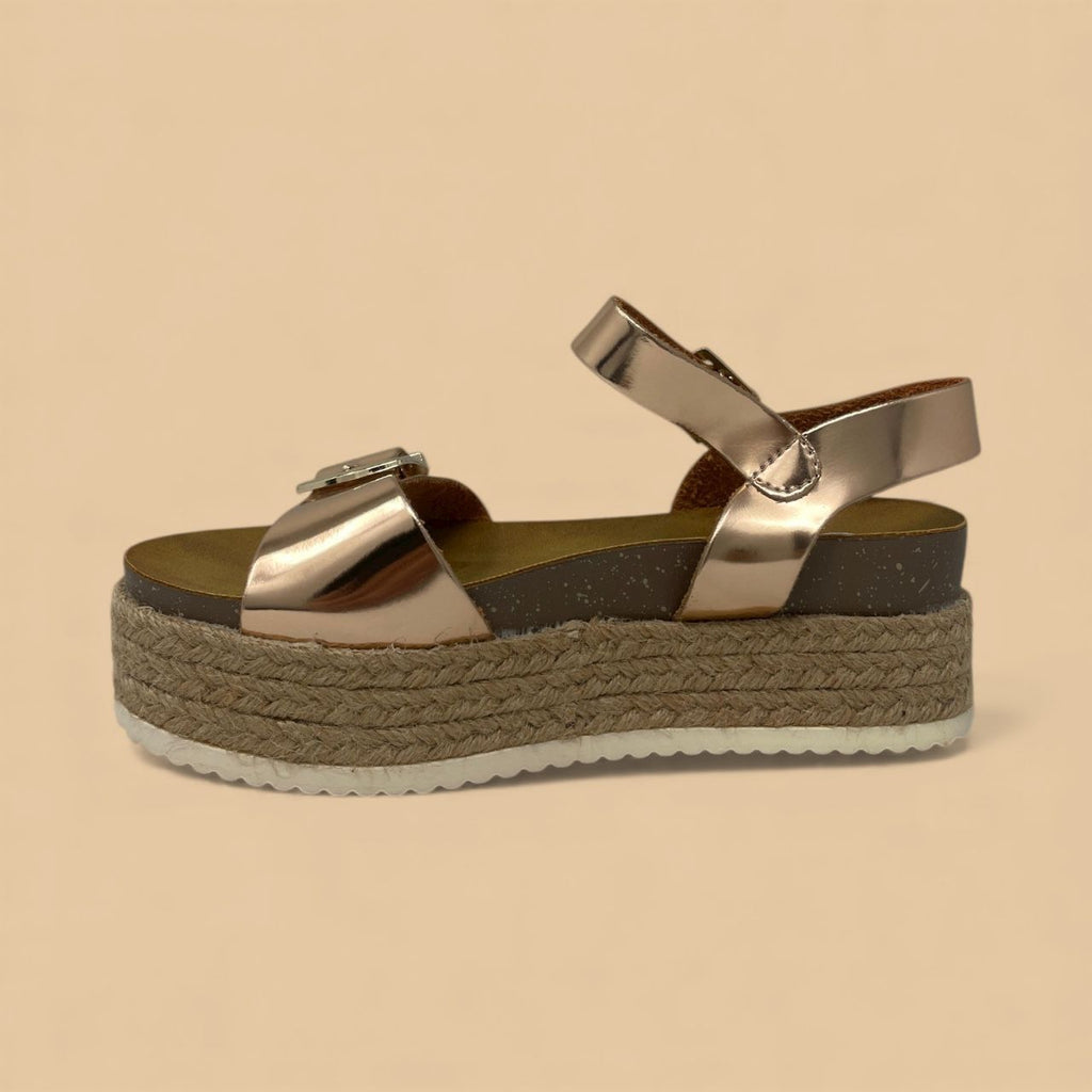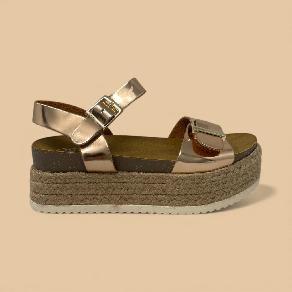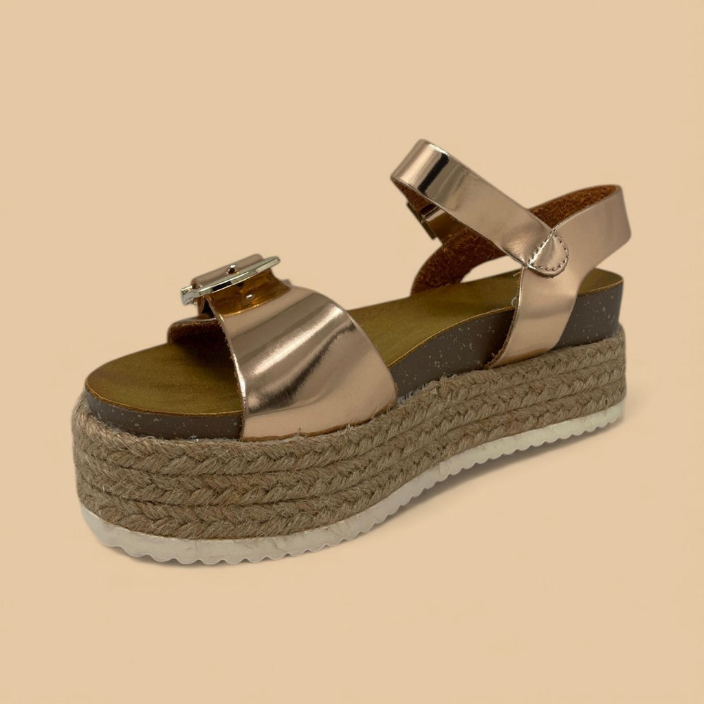 Step out in vibrant style with this striking rose gold platform sandal, perfect for adding a touch of metallic flair to your warm-weather wardrobe. The upper features two wide straps crafted from dazzling rose gold metallic material, secured by polished oversized gold-tone buckles. This bold construction sits atop a towering yet comfortable espadrille-wrapped platform, finished with a contrasting white ridged sole for dependable grip. An adjustable ankle strap ensures a secure fit, making this a chic and stable option for festivals, vacations, or casual weekend looks.