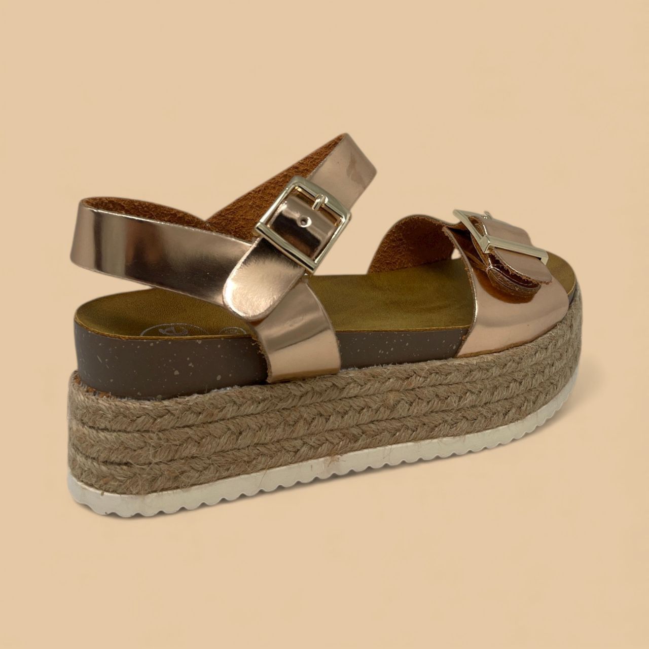 * Rose Gold Metallic Upper with twin wide buckle straps.
