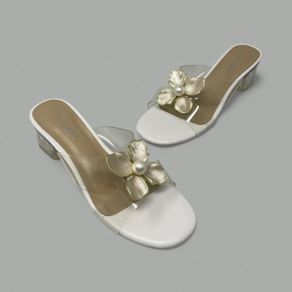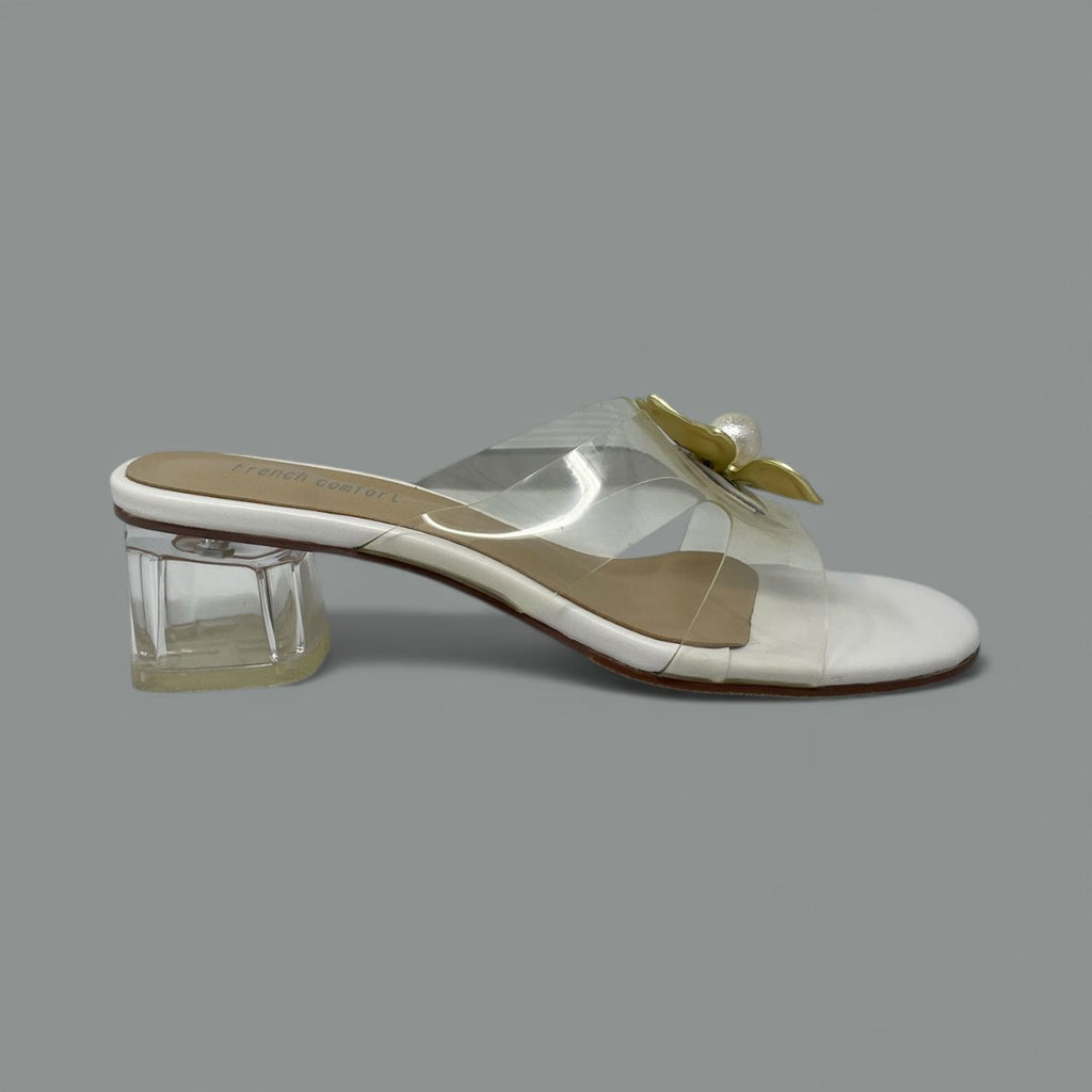 The Berlin mule slide offers a refined touch of romance with its delicate flower appliqué and graceful block heel. The clear vamp strap creates an invisible, modern effect, allowing the floral detail and your pedicure to take center stage.