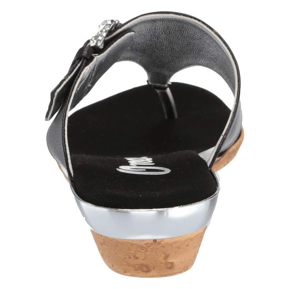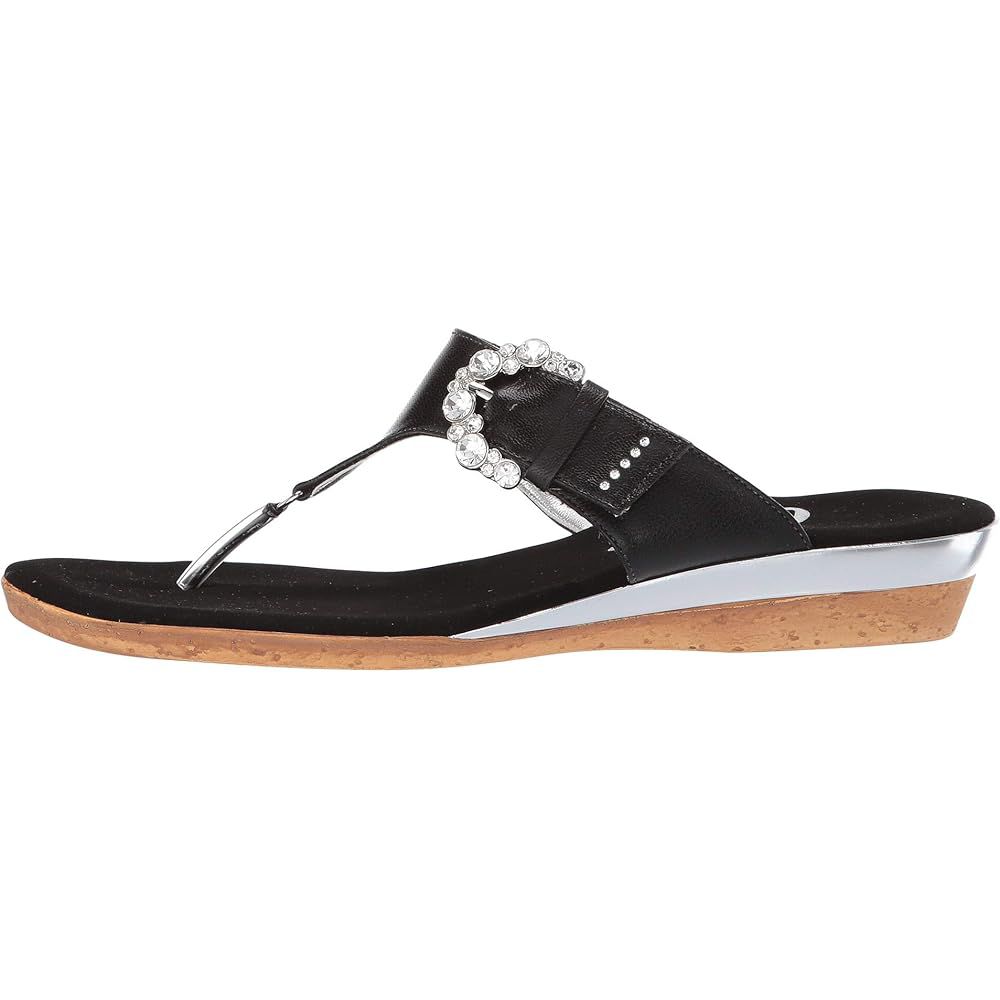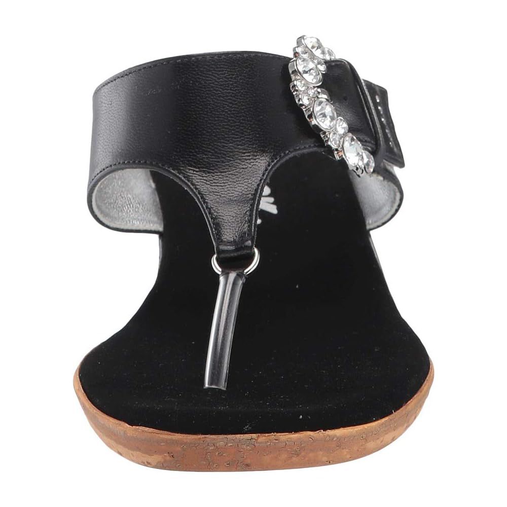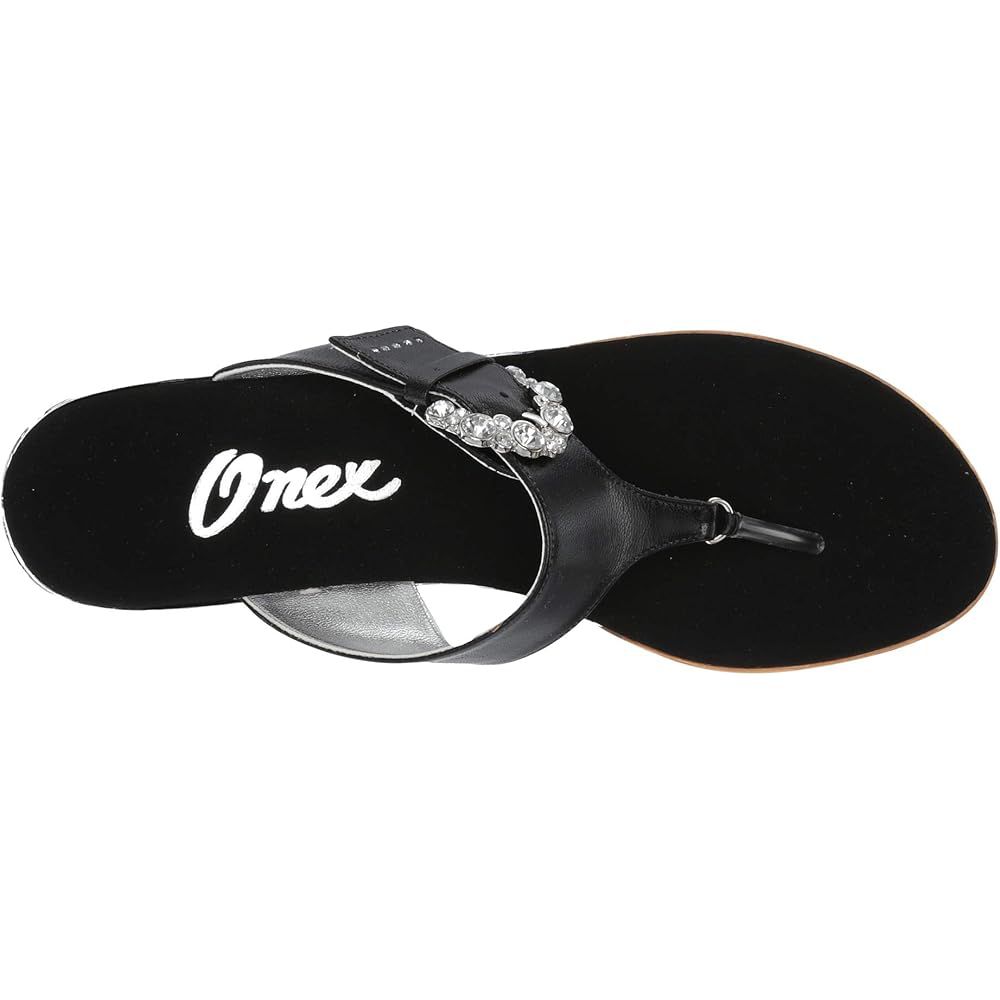 Elevate your warm-weather look with the Salina thong sandal, a striking blend of effortless comfort and evening-ready glamour. Crafted in the USA by Onex, a brand known for its exceptional comfort, this sandal features a smooth black upper and a plush, soft footbed. The centerpiece is the oversized, rhinestone-encrusted buckle detail that catches the light with every step, perfectly set above a sleek, faux-metallic heel trim. The slight wedge offers just the right amount of lift, making this jeweled thong a versatile choice for day-to-night transitions.