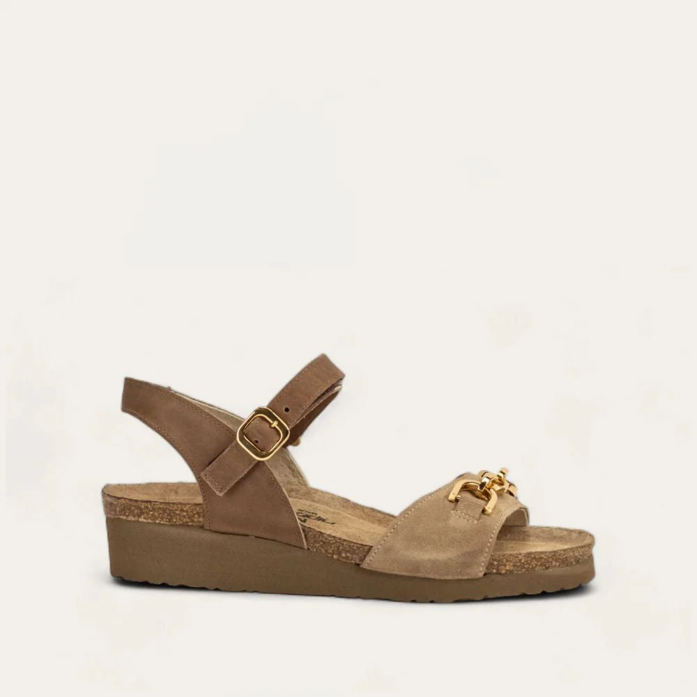 Naot Aubrey is an effortlessly elegant sandal with gold tone chain strap accent. The Aubrey features hook and loop strap at the instep and a backstrap with gore for stability and support. Naot's anatomic cork and latex footbed is wrapped in a pampering suede and molds to the shape of the foot with wear. American Podiatric Medical Association (APMA) Accepted for promoting good foot health.