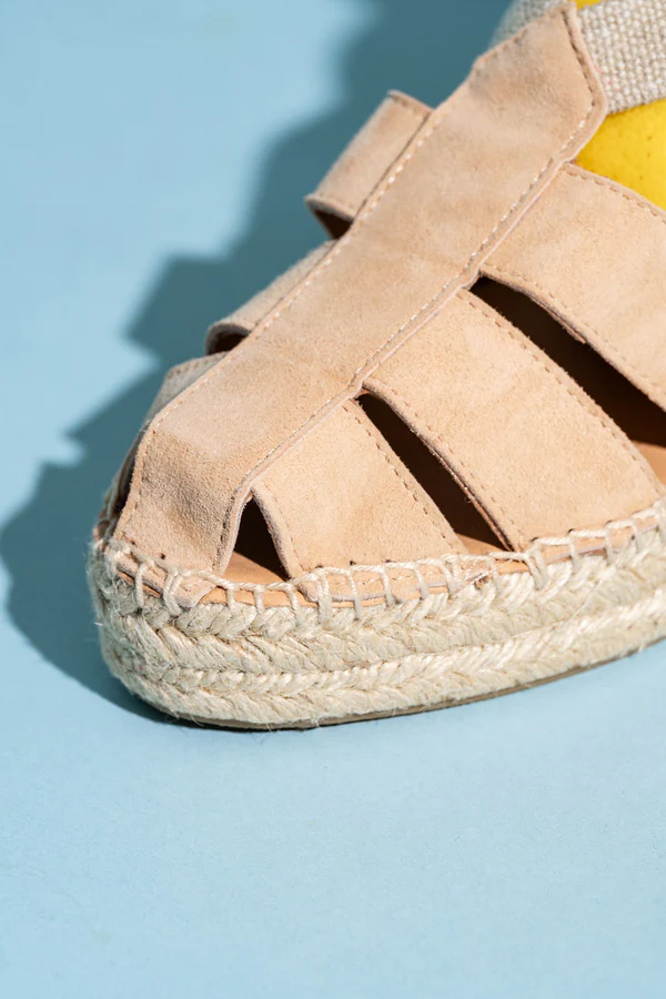 - Braided jute platform for a classic espadrille aesthetic