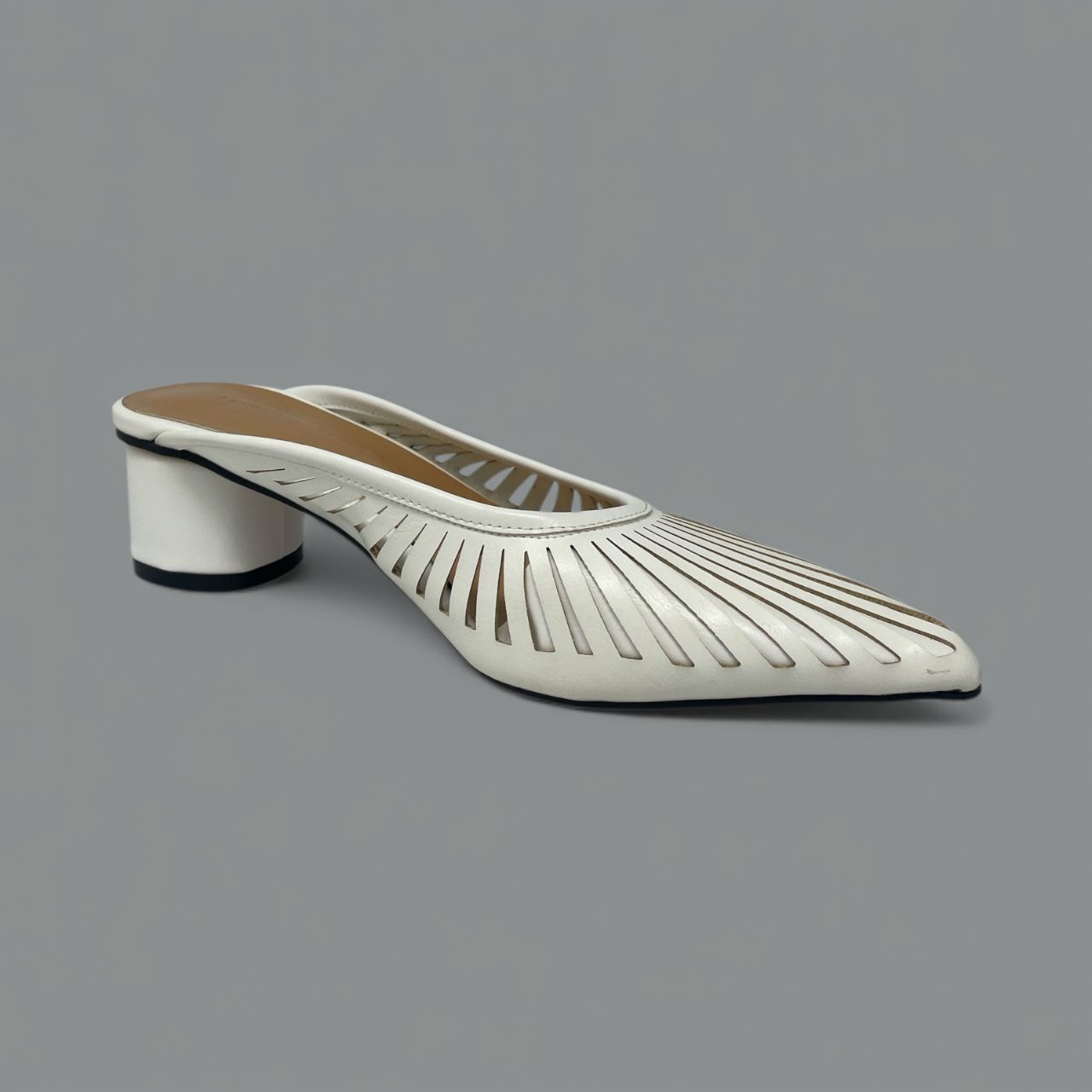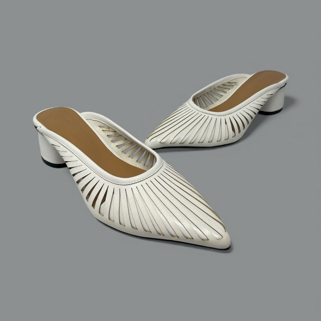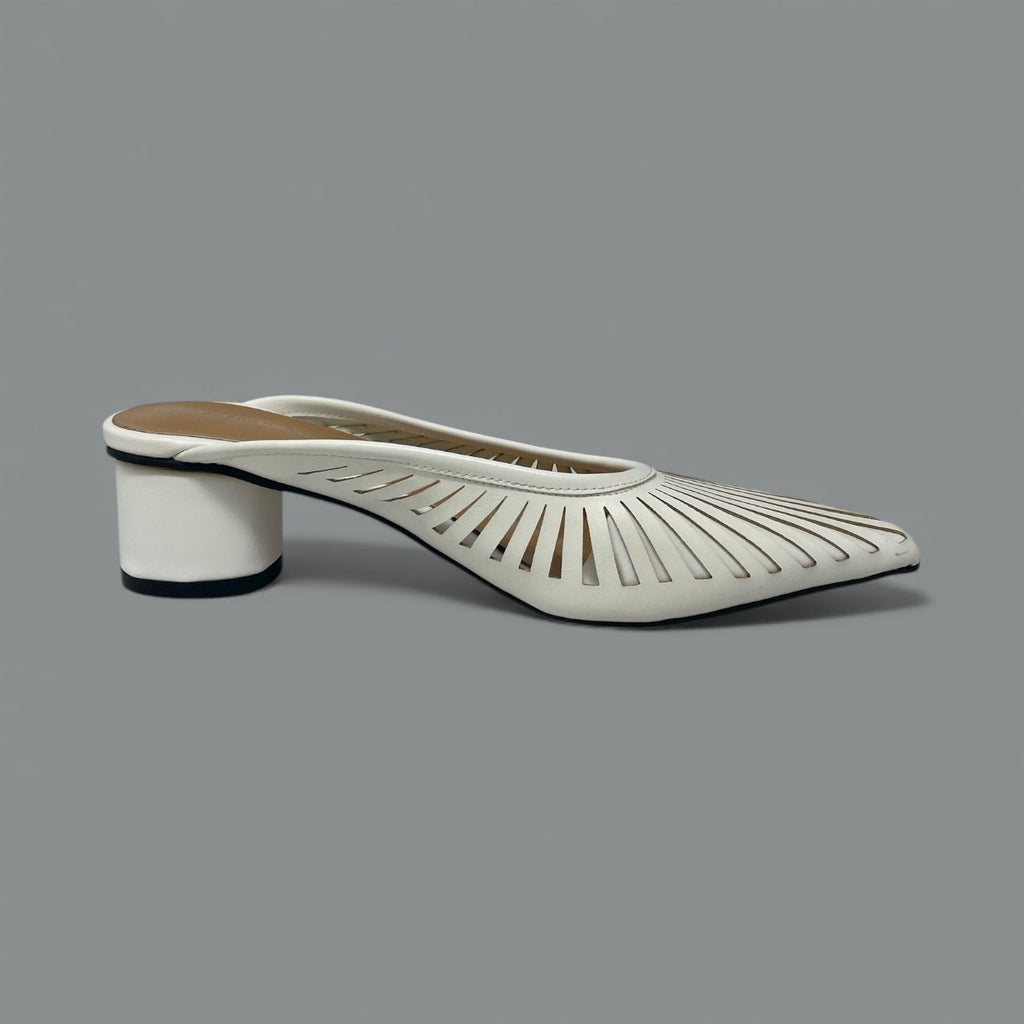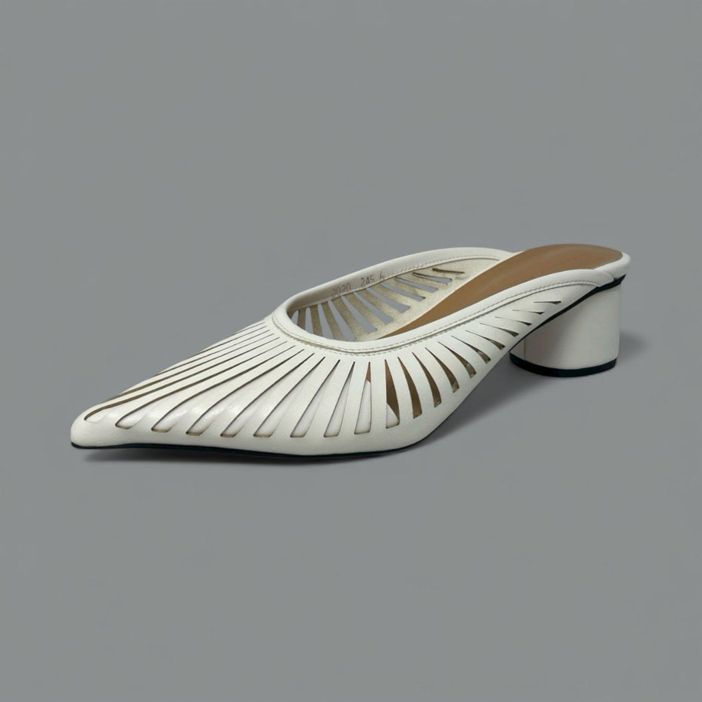 The Alisa mule defines modern sophistication with its sharply tailored shape and exceptional detailing. Crafted in sleek leather, the pointed toe is elevated by a striking sunburst laser-cut pattern, creating a delicate, airy effect that is perfect for warmer weather or polished office wear.