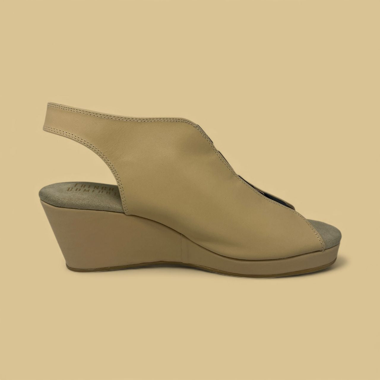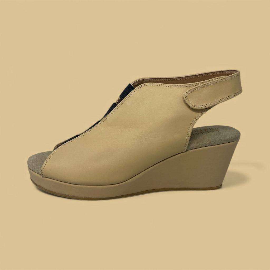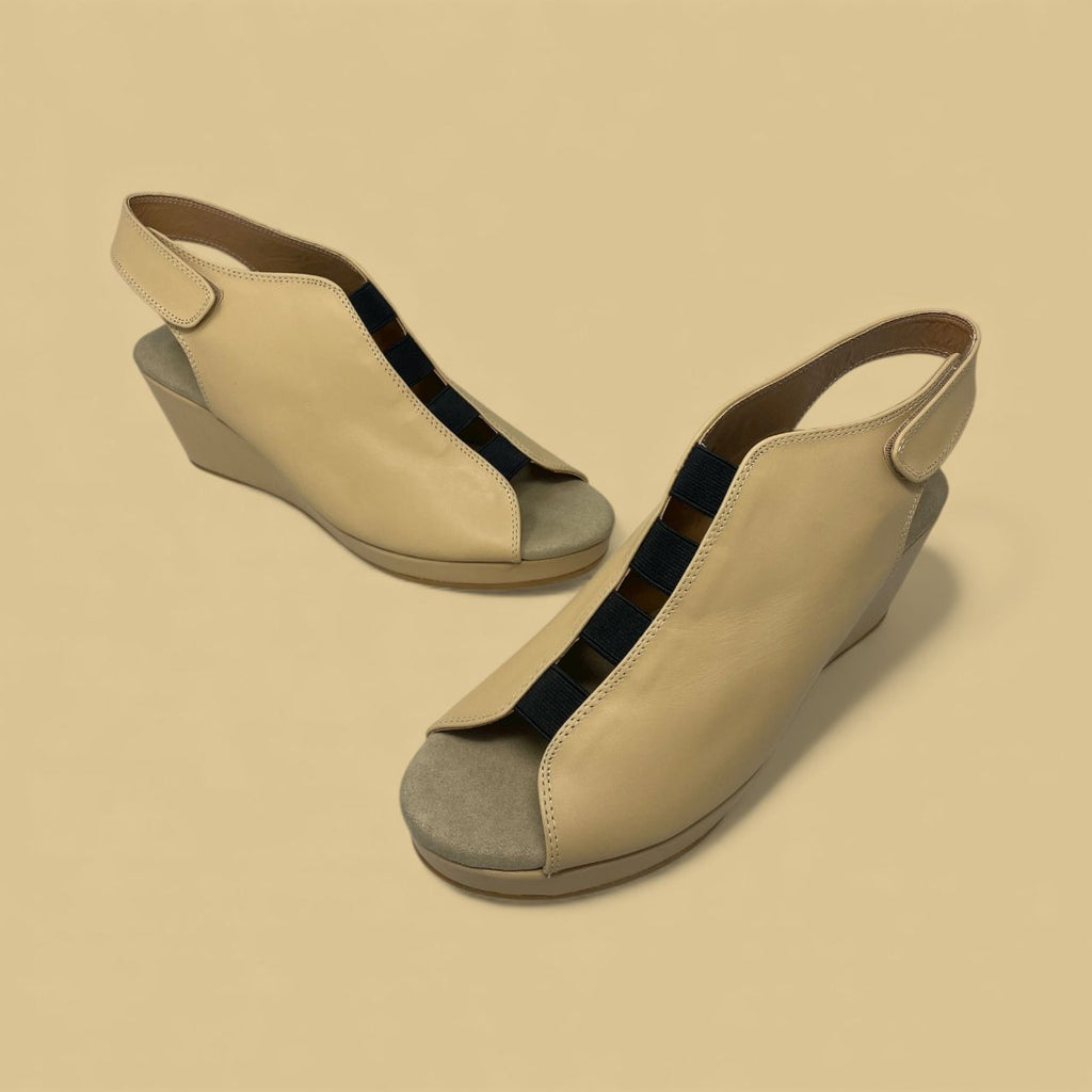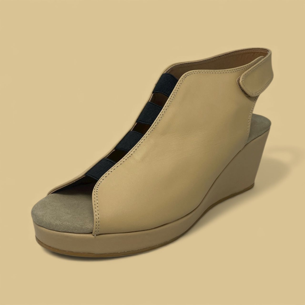 The central panels incorporate elastic goring straps, providing a flexible and custom fit that moves with you throughout the day. A stable, comfortable wedge heel gives just the right amount of lift, secured by an adjustable hook-and-loop closure at the ankle for graceful, effortless wear.