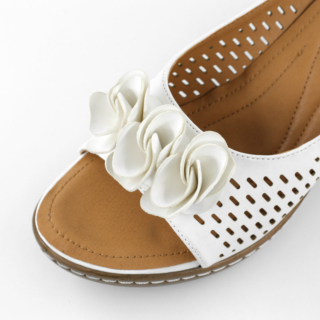 A dimensional, layered floral appliqué graces the toe, lending a feminine, resort-ready charm to the silhouette. The stable wedge heel provides flattering height and a natural walking experience, while the contrasting stitched outsole highlights the quality craftsmanship.