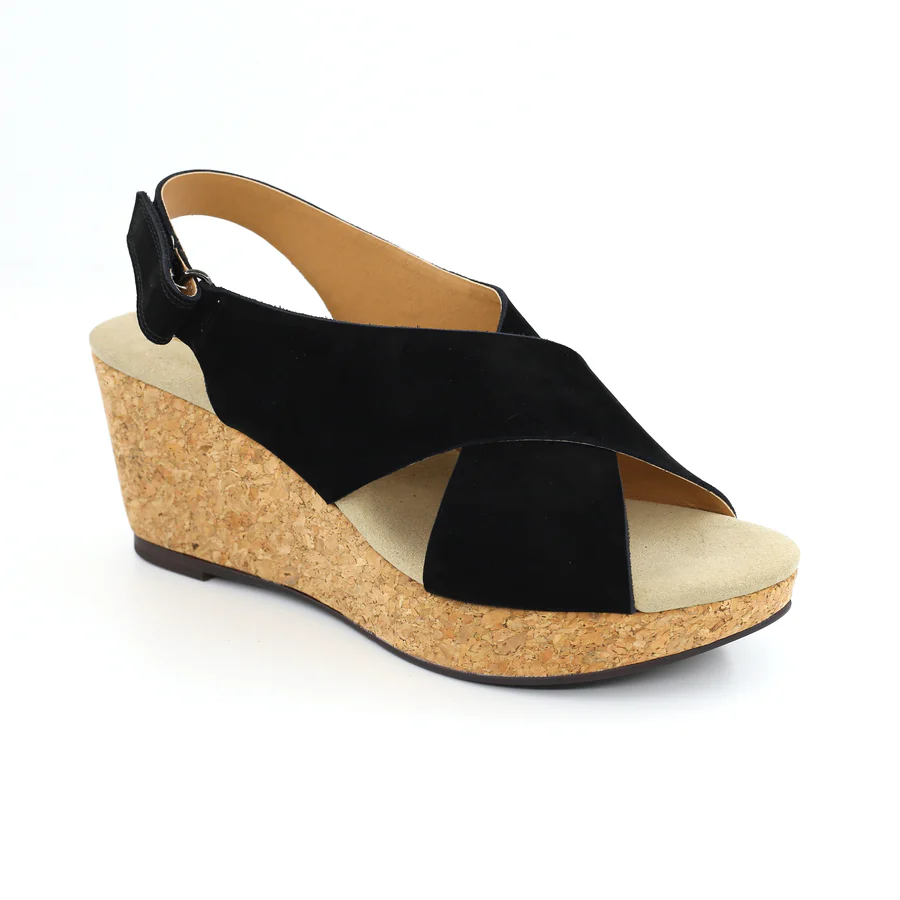 The upper features broad, crisscrossing suede straps that gently hug the foot for a secure, comfortable fit. The adjustable slingback strap ensures personalized stability, fastening discreetly for a polished finish that keeps the foot securely in place.
