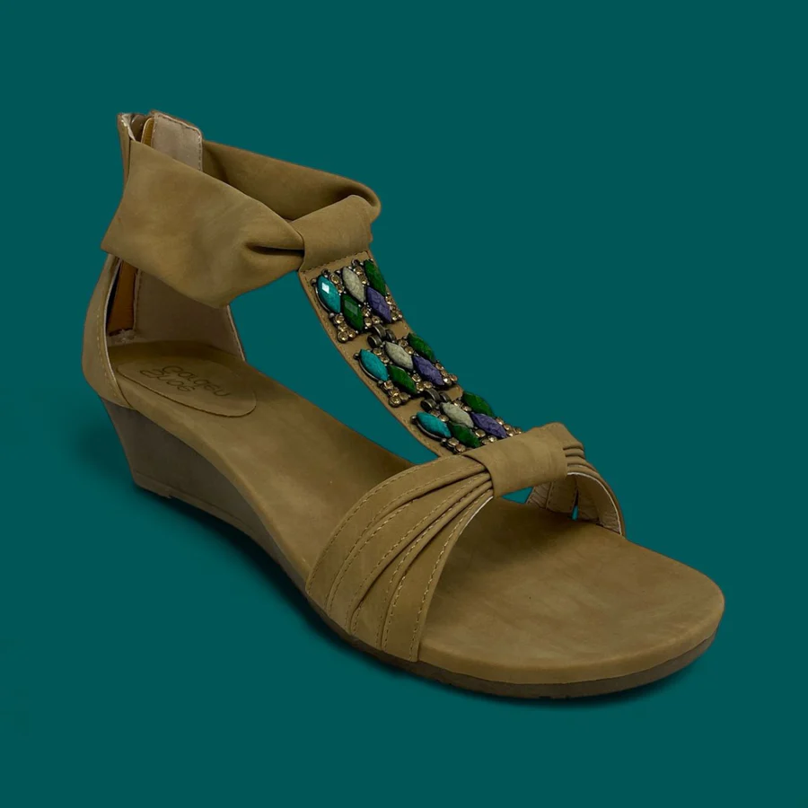 The true highlight is the vibrant jeweled T-strap, featuring an array of meticulously set stones in shades of purple, teal, and green, adding a captivating sparkle. A comfortable low wedge heel ensures stability and all-day wearability, while the convenient back zipper allows for easy dressing.