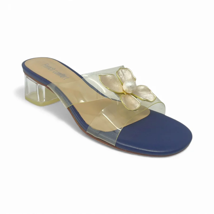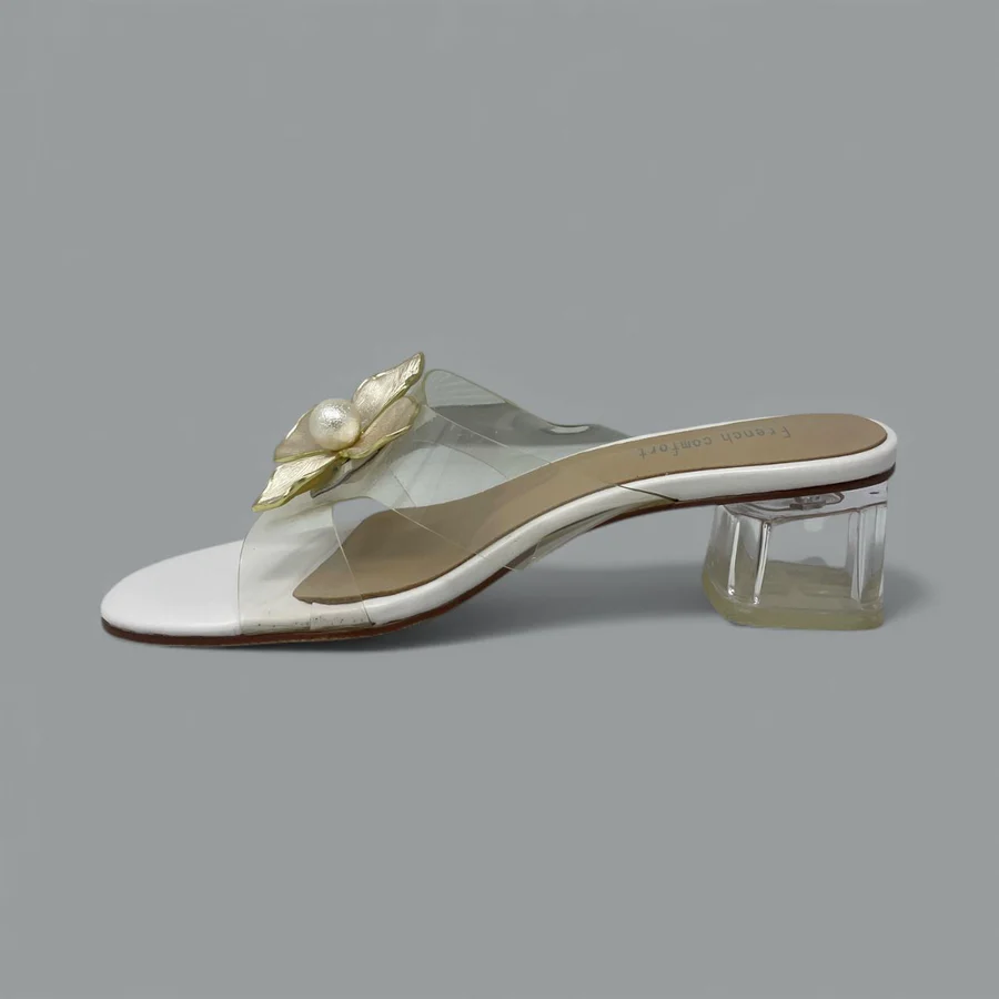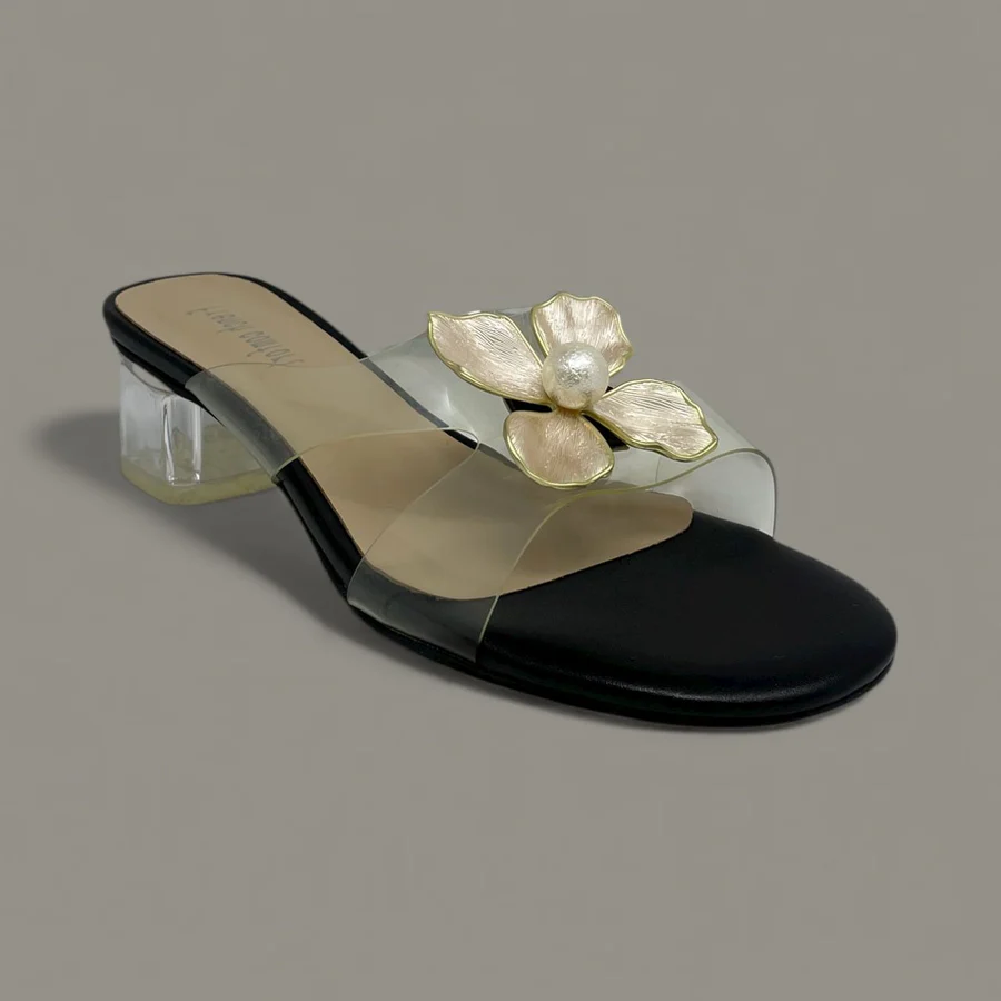 The Berlin mule slide offers a refined touch of romance with its delicate flower appliqué and graceful block heel. The clear vamp strap creates an invisible, modern effect, allowing the floral detail and your pedicure to take center stage.