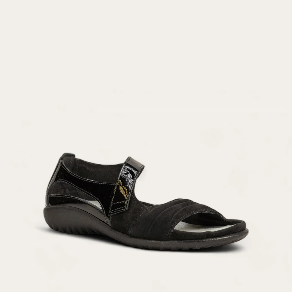 The Papaki is a fashionable sandal with a padded front strap & a contrasting ruched design. This style has a padded heel cup and a hook and loop closure at the instep. Naot's removable, anatomic cork & latex footbed is wrapped in pampering suede and molds to the shape of the foot with wear. The Koru Collection features a 1" polyurethane sole which is extremely lightweight, durable & slip resistant. This collection uses a hand-sewn stroble construction making it strong and extremely flexible. American Podiatric Medical Association (APMA) Accepted for promoting good foot health. Papaki fits our Koru Footbed.