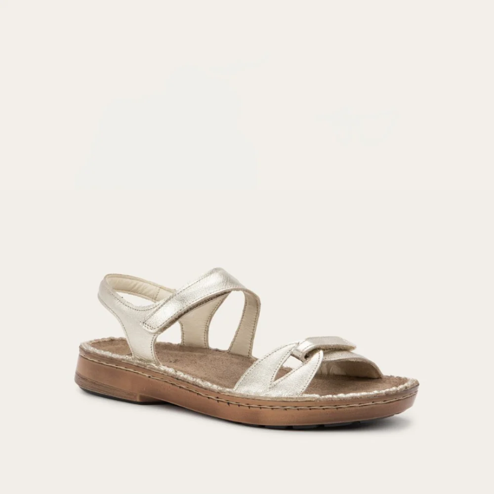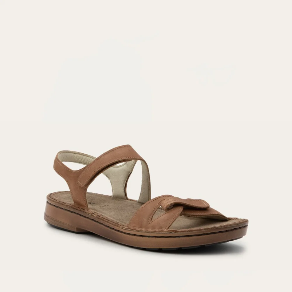 Introducing Evora - where comfort meets timeless elegance in every step. This flat backstrap sandal features plush padding and secure hook and loop closures, ensuring a snug and adjustable fit. Designed for all-day wearability, Evora combines practicality with understated sophistication, making it an essential addition to your wardrobe for any occasion. Crafted with Naot's removable, anatomic cork and latex footbed wrapped in pampering suede, these shoes mold to the shape of your foot with wear, ensuring personalized comfort. Plus, it's American Podiatric Medical Association (APMA) accepted for promoting good foot health. Our patented Naot Replacement Footbeds are also available, ensuring extended comfort and support. The Utopia Collection's 1.25" polyurethane sole offers both elegance and support.