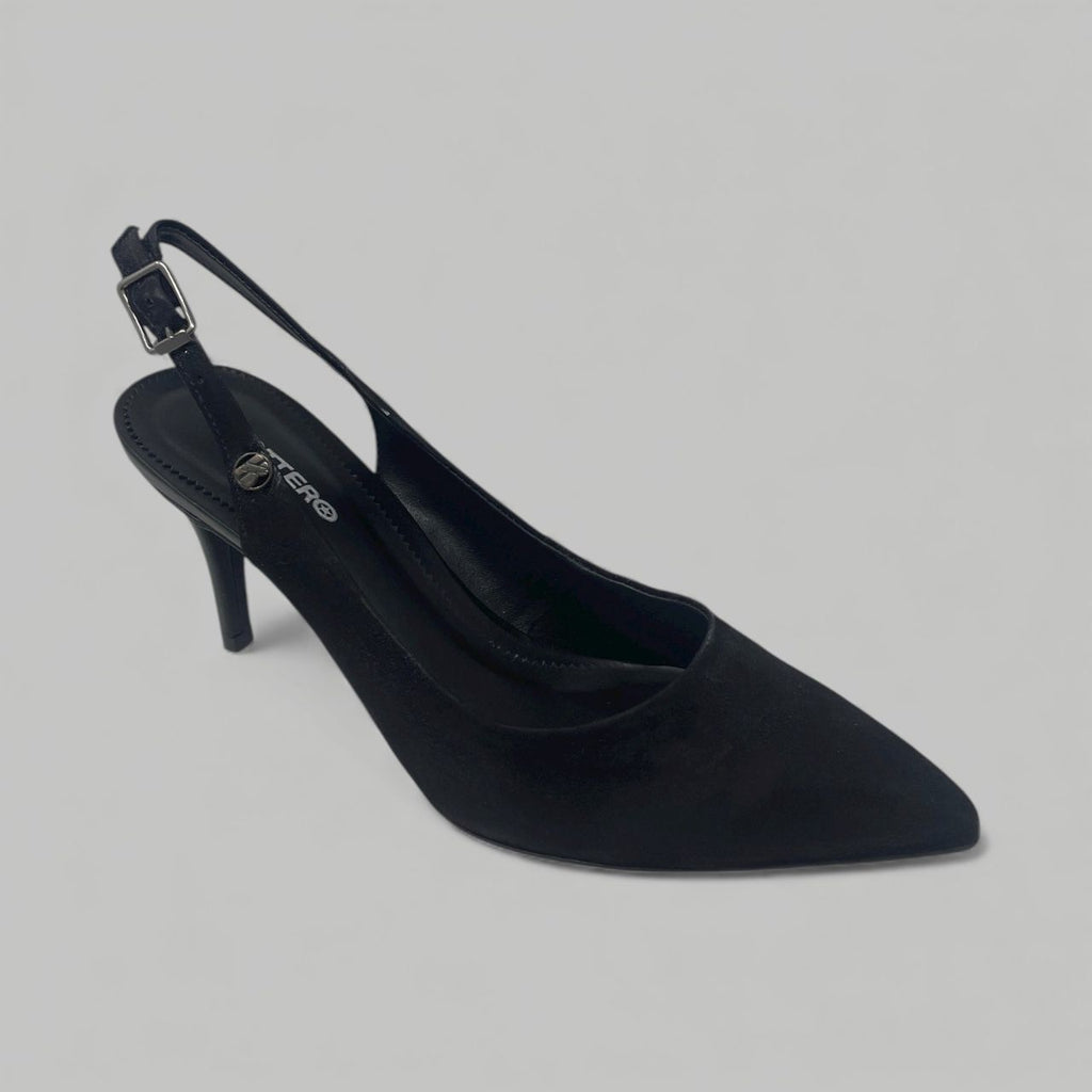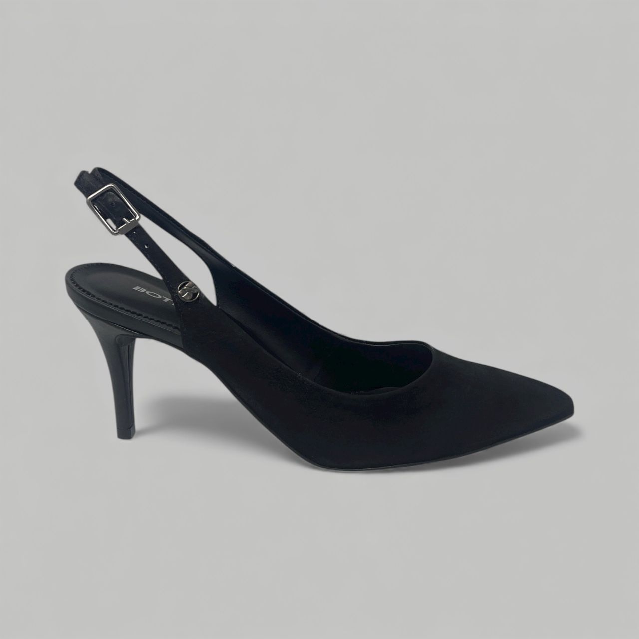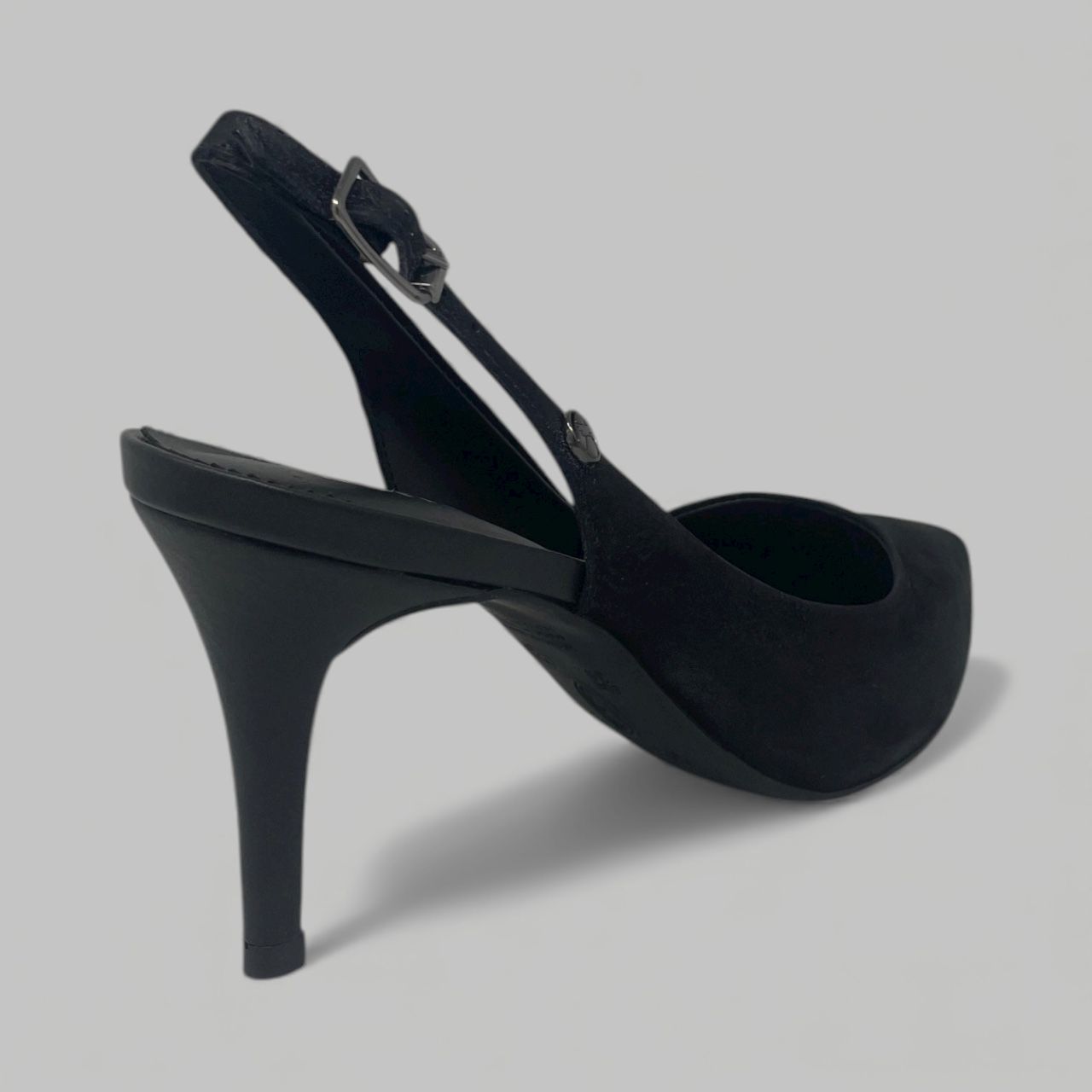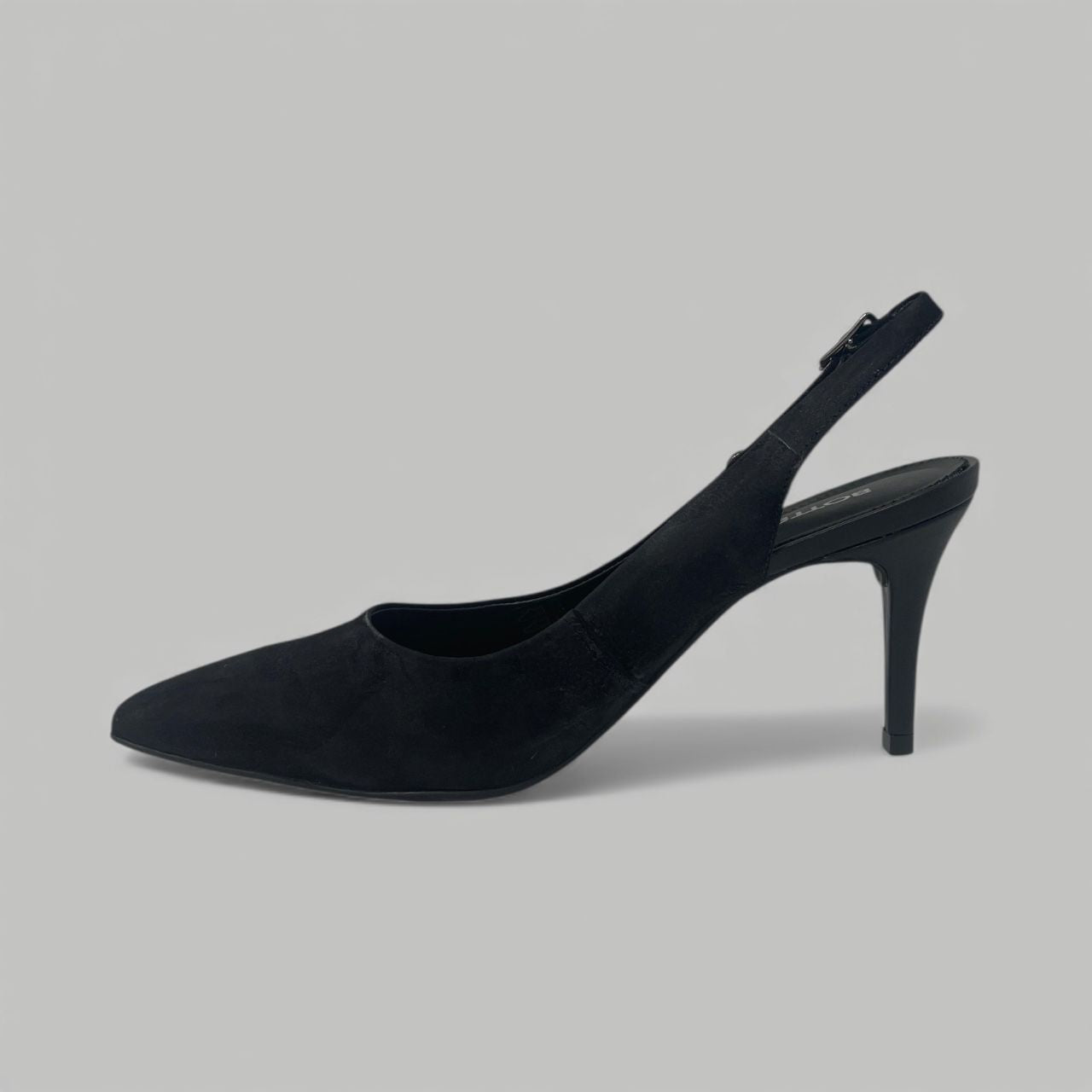 Elevate your look instantly with this timeless slingback pump, designed to deliver both grace and stability. The shoe features a sharp pointed toe and a sculpted upper crafted from luxurious black suede or microsuede, giving it a deep, matte finish that is rich to the touch. The slender, proportionate stiletto heel adds elegant height perfect for professional settings or evening events. A delicate adjustable ankle strap ensures a secure fit, while the subtle metallic accent near the arch adds a touch of signature flair. This pump is meticulously balanced, providing an effortlessly sophisticated silhouette that pairs flawlessly with tailored trousers, cocktail dresses, or modern denim.