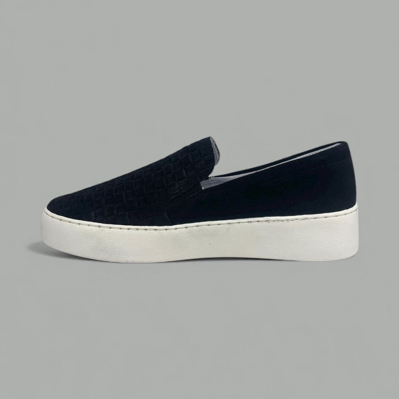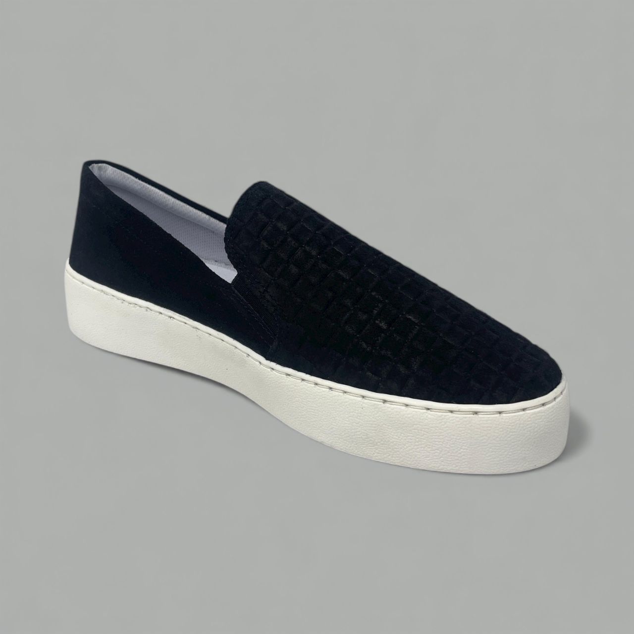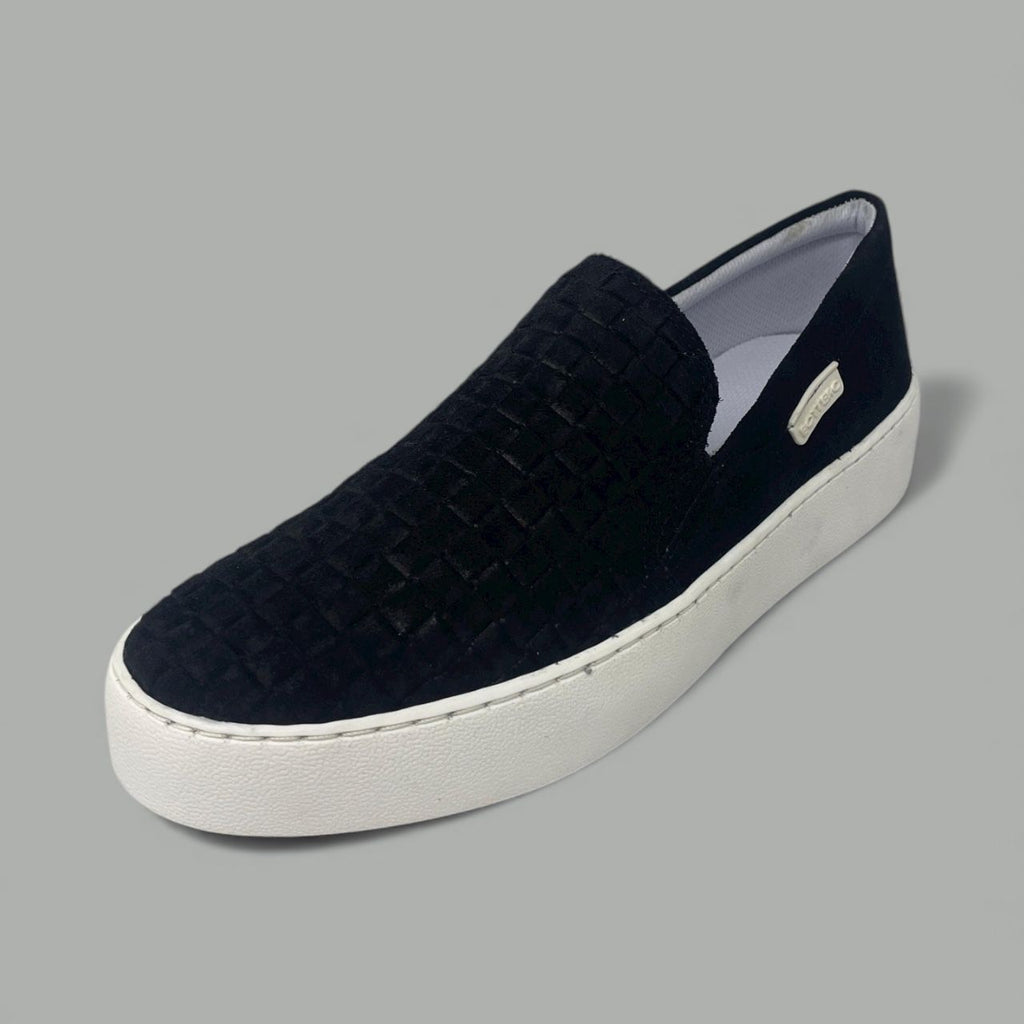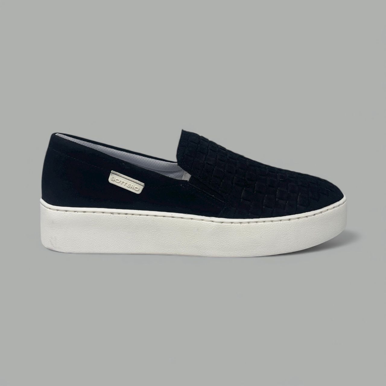 The Bottero platform slip-on sneaker perfectly blends contemporary texture with everyday comfort. Crafted with a genuine suede upper, the shoe features an eye-catching woven basket-weave pattern across the vamp, adding sophisticated depth to the classic black silhouette. This clean, modern design makes it an effortless statement piece for weekend outings or elevated casual ensembles.
