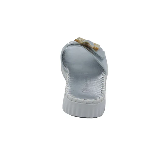 A sleek leather slide accented by an adjustable velcro buckle is ready to upgrade your warm-weather style.