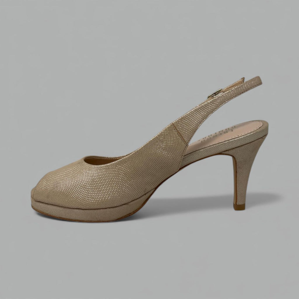 A slender, comfortable covered heel offers graceful height, balanced by a hidden front platform that reduces the pitch for enhanced wearability. The adjustable slingback strap ensures a secure and polished fit, completing this essential, versatile pump.