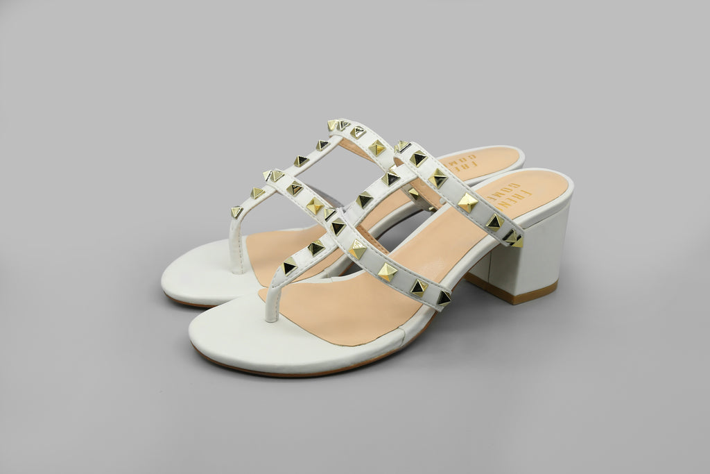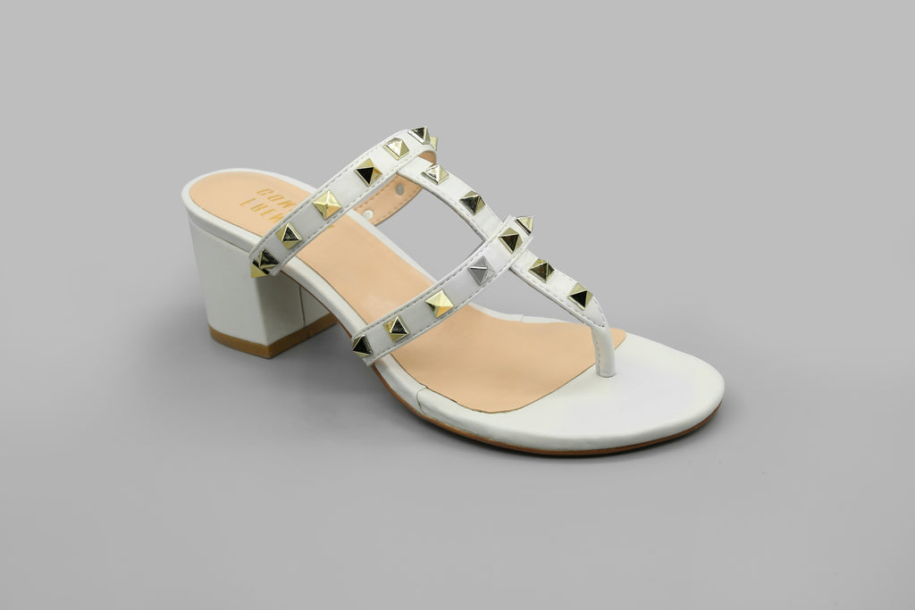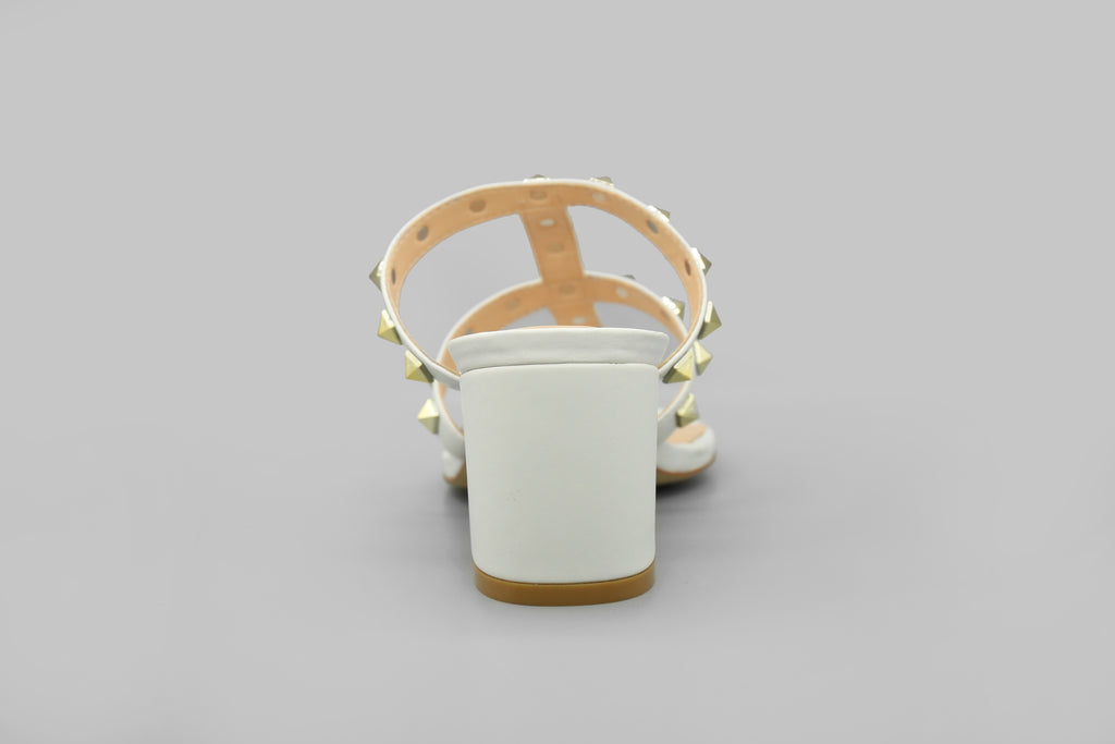 The Flora mule blends effortless slip-on style with a confident, edgy detail. This thong-style slide is defined by its two slender vamp straps, which are beautifully embellished with polished gold-toned pyramid studs, adding a chic, rock-and-roll inspired texture.