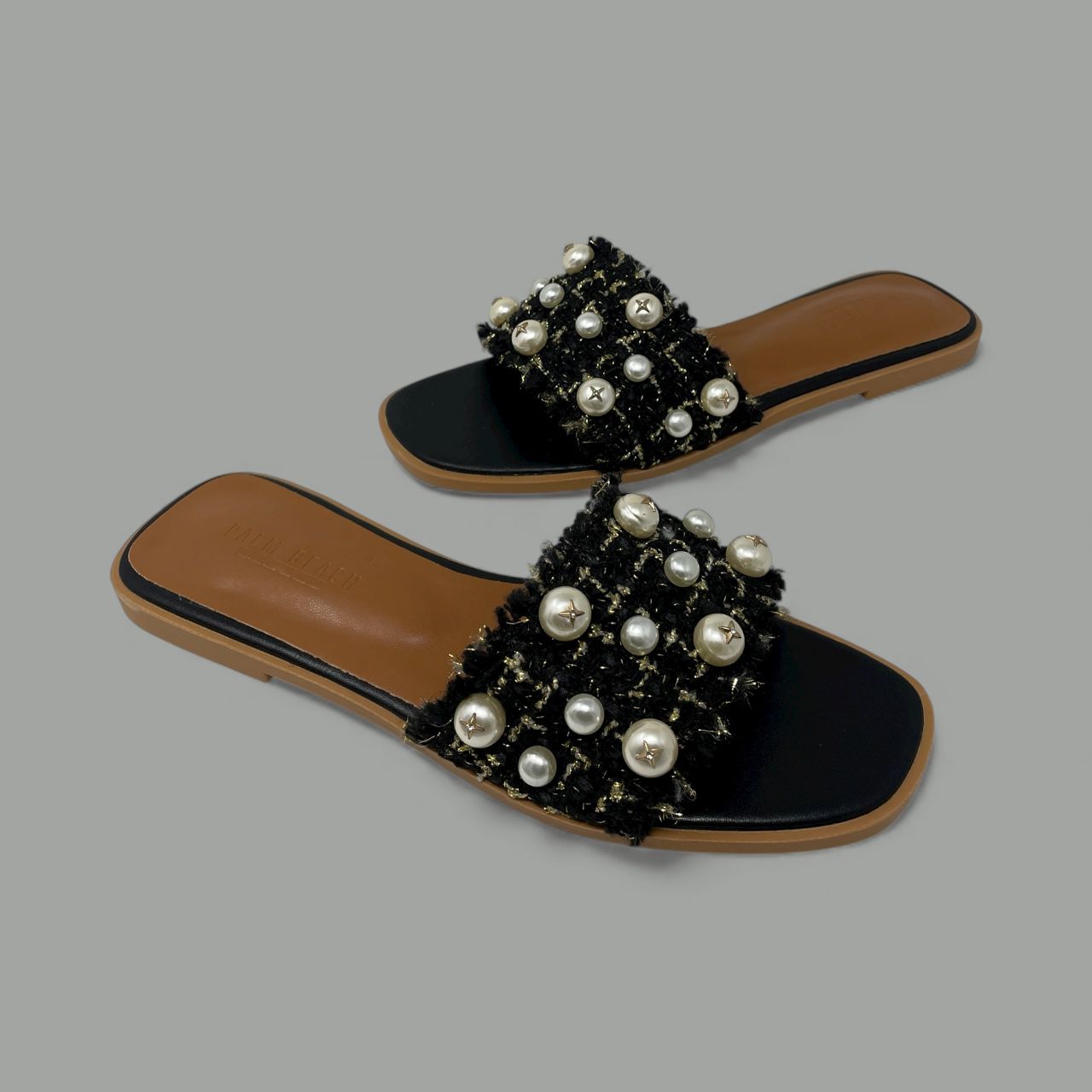 A constellation of oversized faux pearls and star-shaped accents instantly polishes this flat sandal, turning it into a statement piece. The square-toe footbed, complemented by a soft, contrasting color sole, ensures both a contemporary look and easy, comfortable wear for resort days or casual dinners.