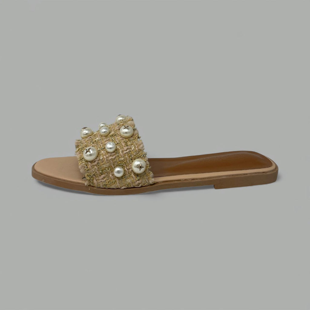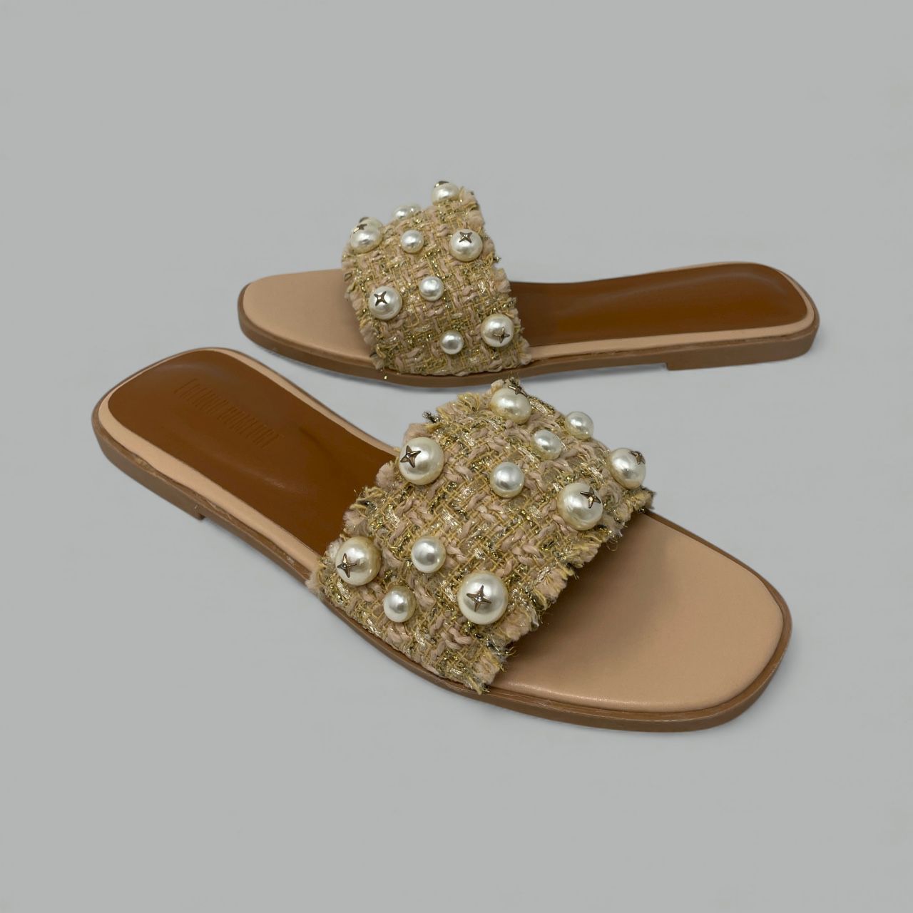 A constellation of oversized faux pearls and star-shaped accents instantly polishes this flat sandal, turning it into a statement piece. The square-toe footbed, complemented by a soft, contrasting color sole, ensures both a contemporary look and easy, comfortable wear for resort days or casual dinners.