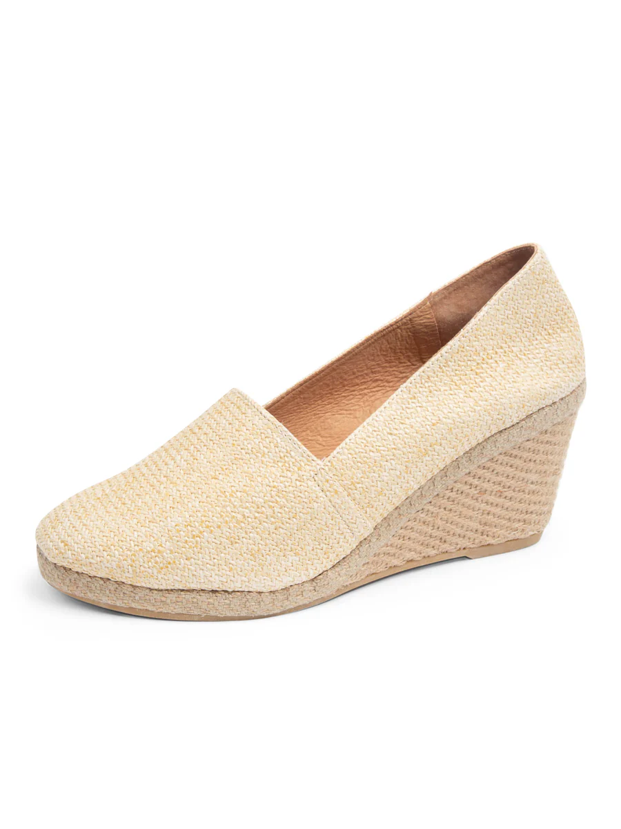 Handcrafted in Spain in small, artisan-led batches, the Mallorca Espadrille offers a modern take on a timeless classic. The structured square toe brings contemporary elegance, while the woven beige raffia adds natural texture and warm-weather ease. Set on a handwoven jute wedge with a softly cushioned footbed, it delivers effortless comfort and refined simplicity. Lightweight, versatile, and beautifully made, this closed-toe espadrille is a chic everyday essential for sunlit seasons.