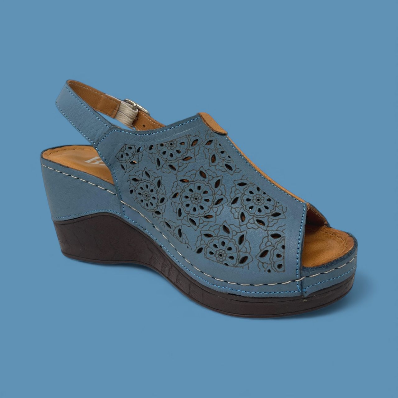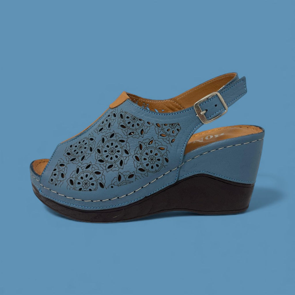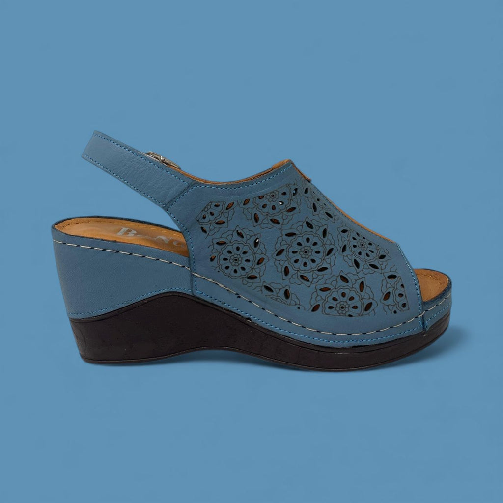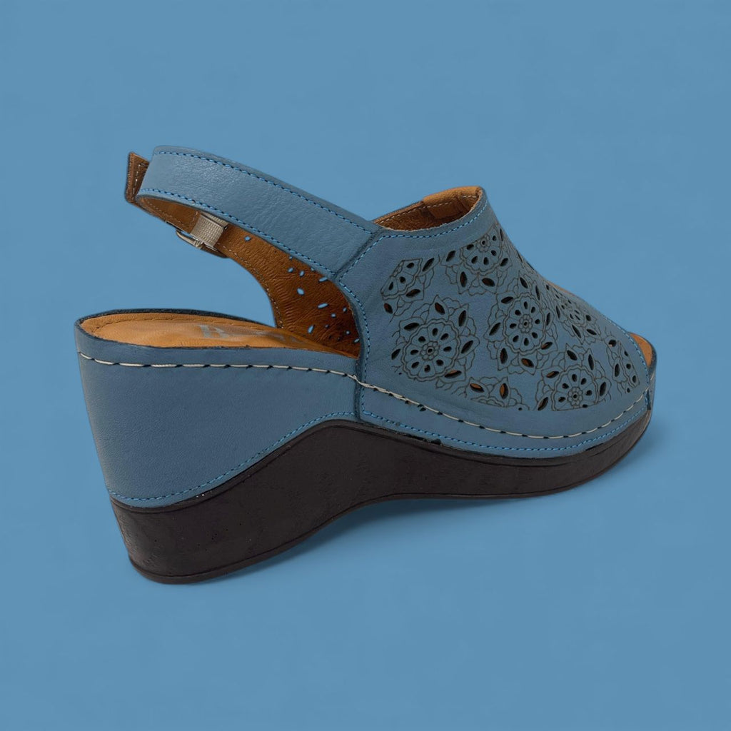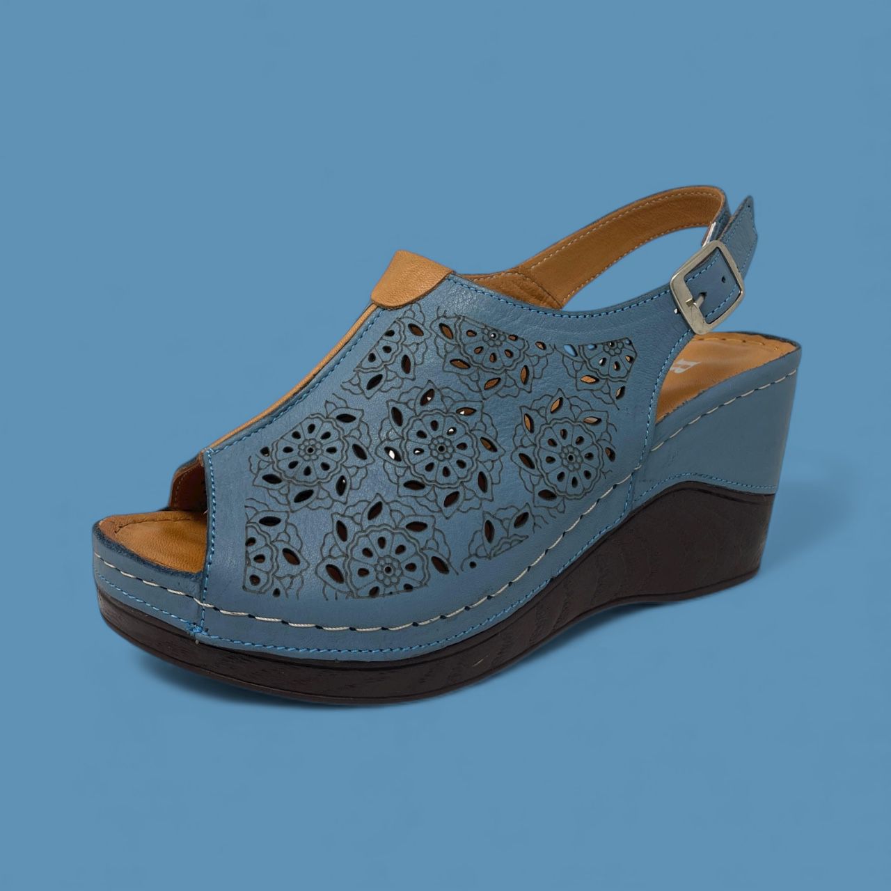 This slingback wedge is crafted from soft, genuine leather in a striking dusty blue hue. The upper features an intricate, laser-cut floral pattern that elevates the design and enhances breathability for warm weather. A soft, cushioned leather insole rests on a comfortable low wedge platform, giving you flattering lift without the fatigue of a high heel. Finished with classic contrast stitching and an adjustable buckle strap, this sandal offers a secure, stylish fit for casual outings, city strolls, or beach vacations.