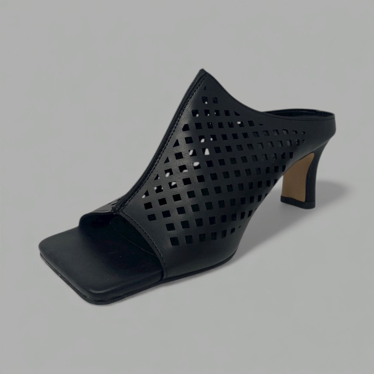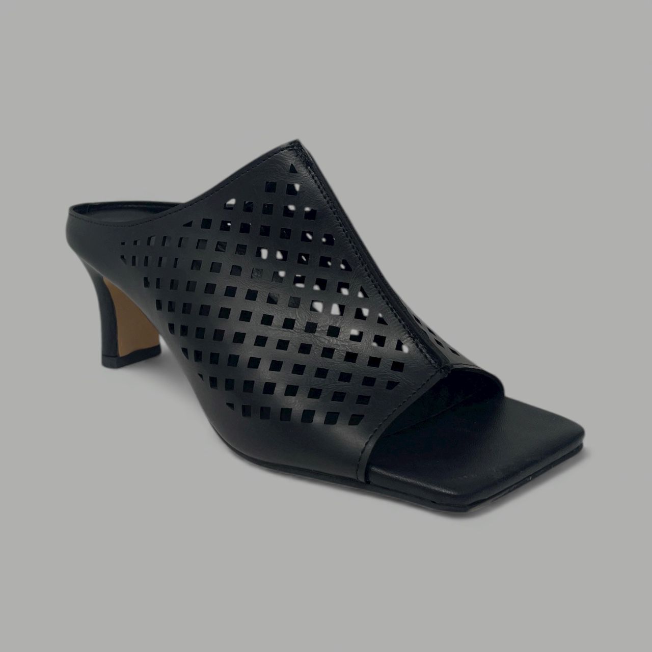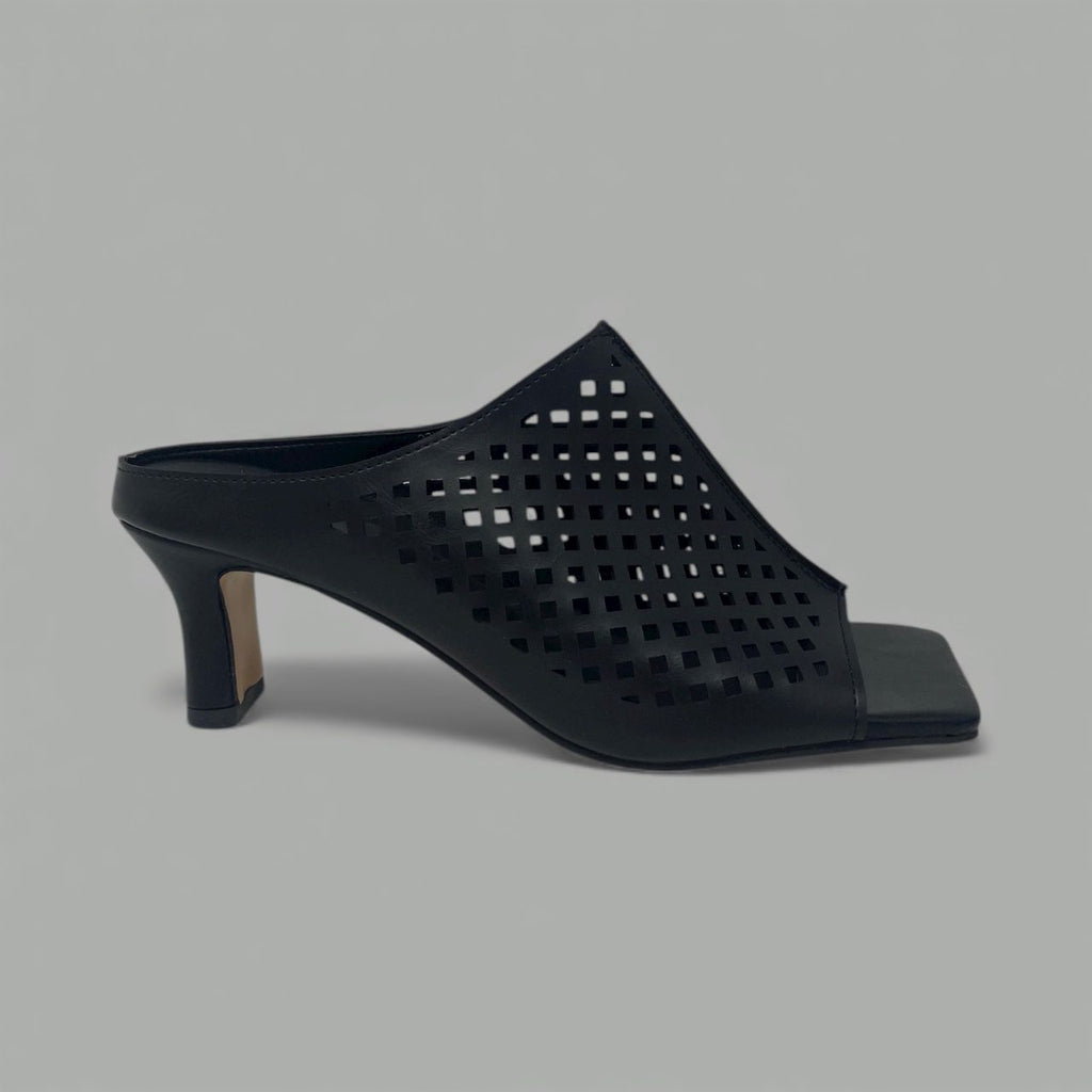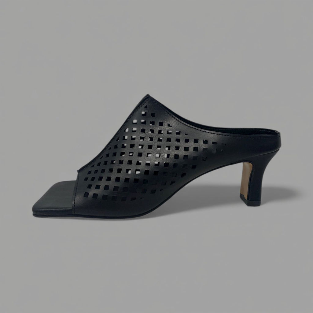 This shoe presents a high-fashion, slip-on style with a black leather upper set on a modern, square-toe footbed. The mule is distinguished by its vamp, which features a wide, elegant strap crafted from high-quality leather and adorned with a precise perforated grid pattern. This lattice design creates breathable texture and visual interest, transitioning seamlessly from the open square toe up the foot.