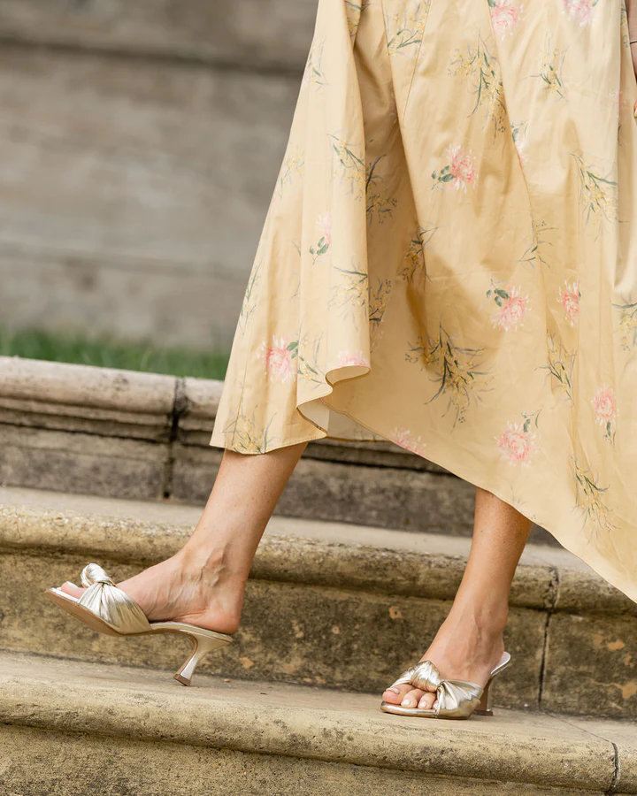 Gold slides updated with a flared heel yet timeless knotted leather design. Refined and elegant, these soft metallic slides are as comfortable as they are beautiful.