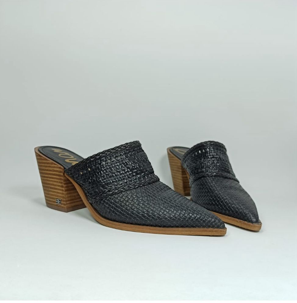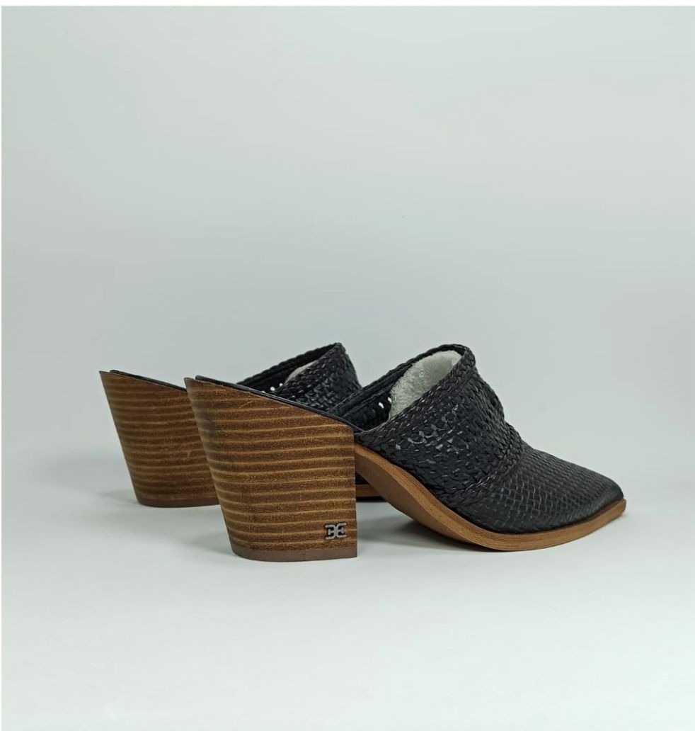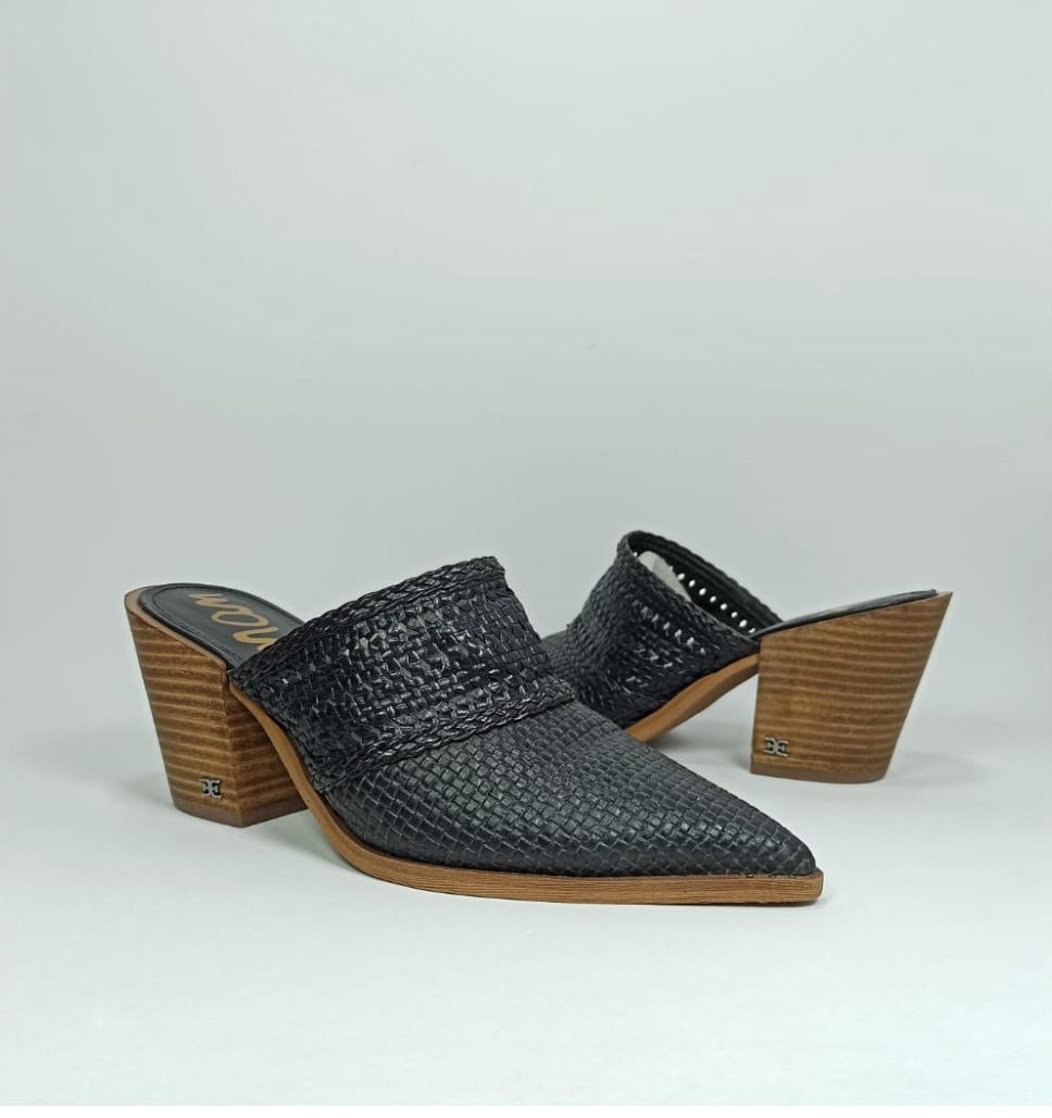 The upper features a rich, tightly woven black leather with a pointed-toe profile that elegantly elongates the leg. A subtle braided leather detail at the collar adds artisanal charm. Grounded by a striking, medium-height stacked wooden block heel, the Lilliana offers stability and a beautiful contrast of texture. Slip them on with tailored trousers for a business look or with flowing denim for a sophisticated weekend ensemble.