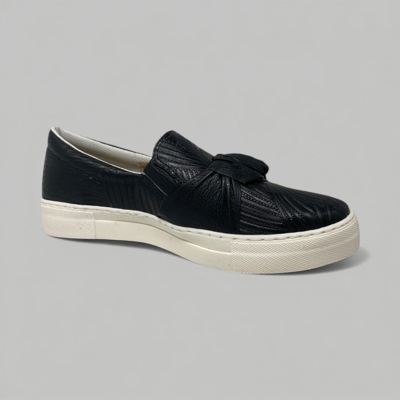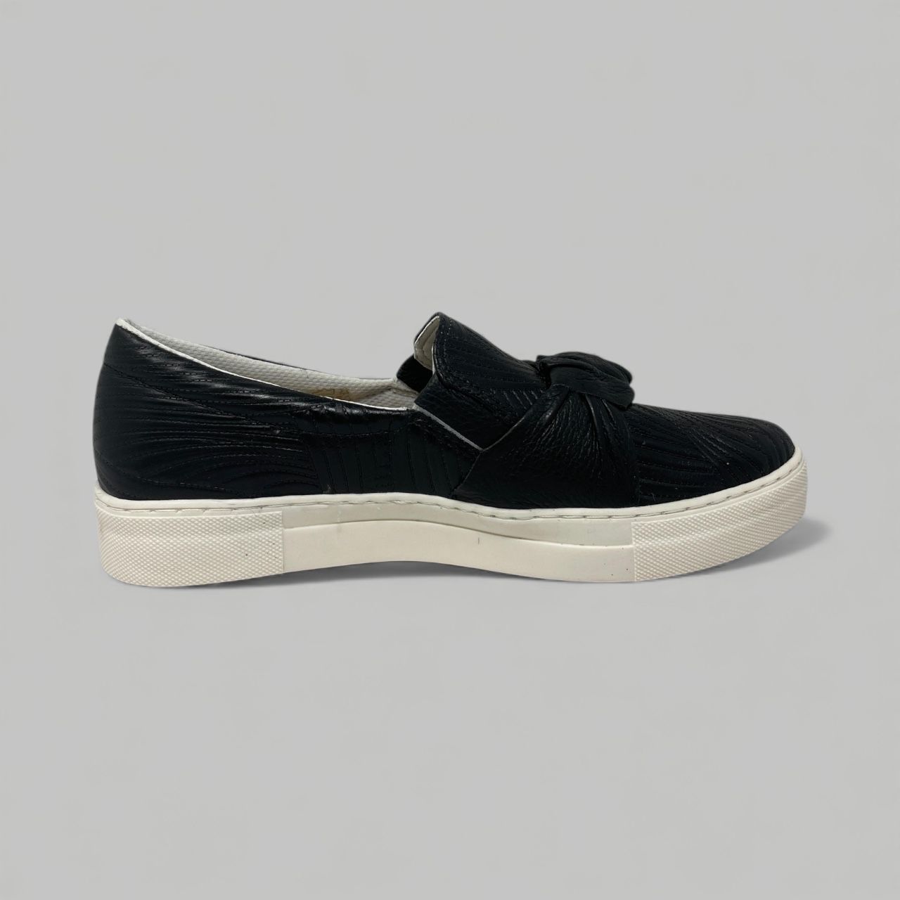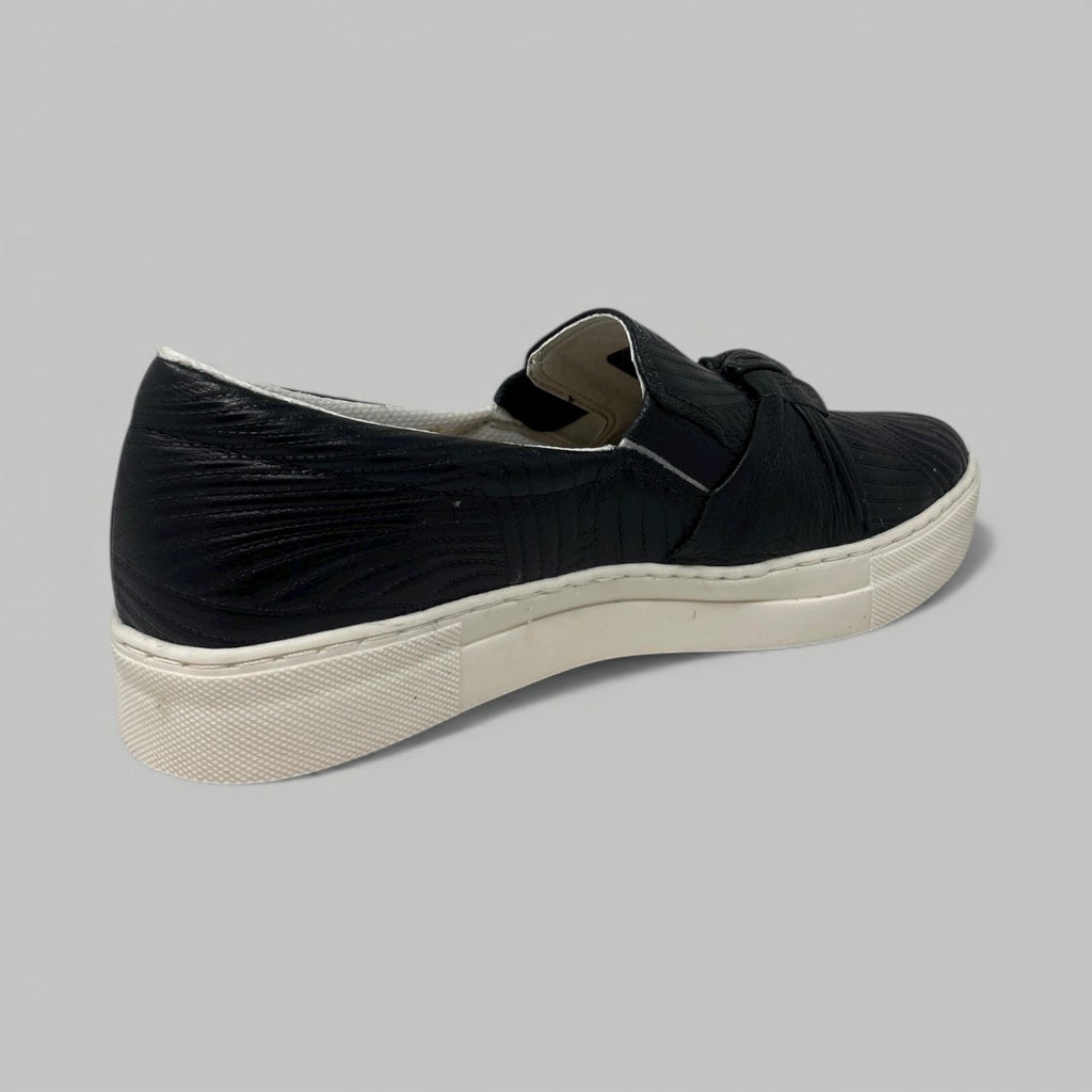 Upgrade your casual wardrobe with this sophisticated slip-on sneaker that features subtle, luxurious detailing. The shoe is crafted from soft black leather that is beautifully embossed with a fine geometric pattern, adding depth and texture. A distinctive knotted leather bow accent sits on the vamp, complemented by a small gold-tone emblem for a touch of refined polish. The shoe sits on a thick, clean white platform cupsole, offering lightweight comfort and a fresh look for effortless pairing with any casual outfit.